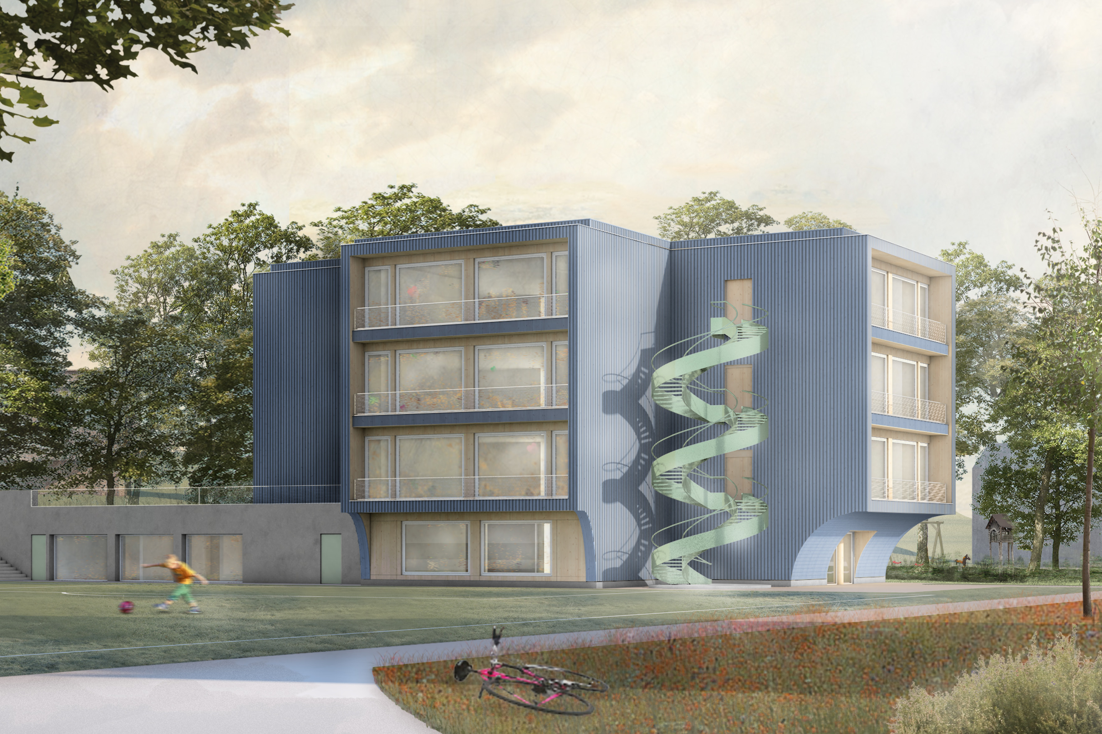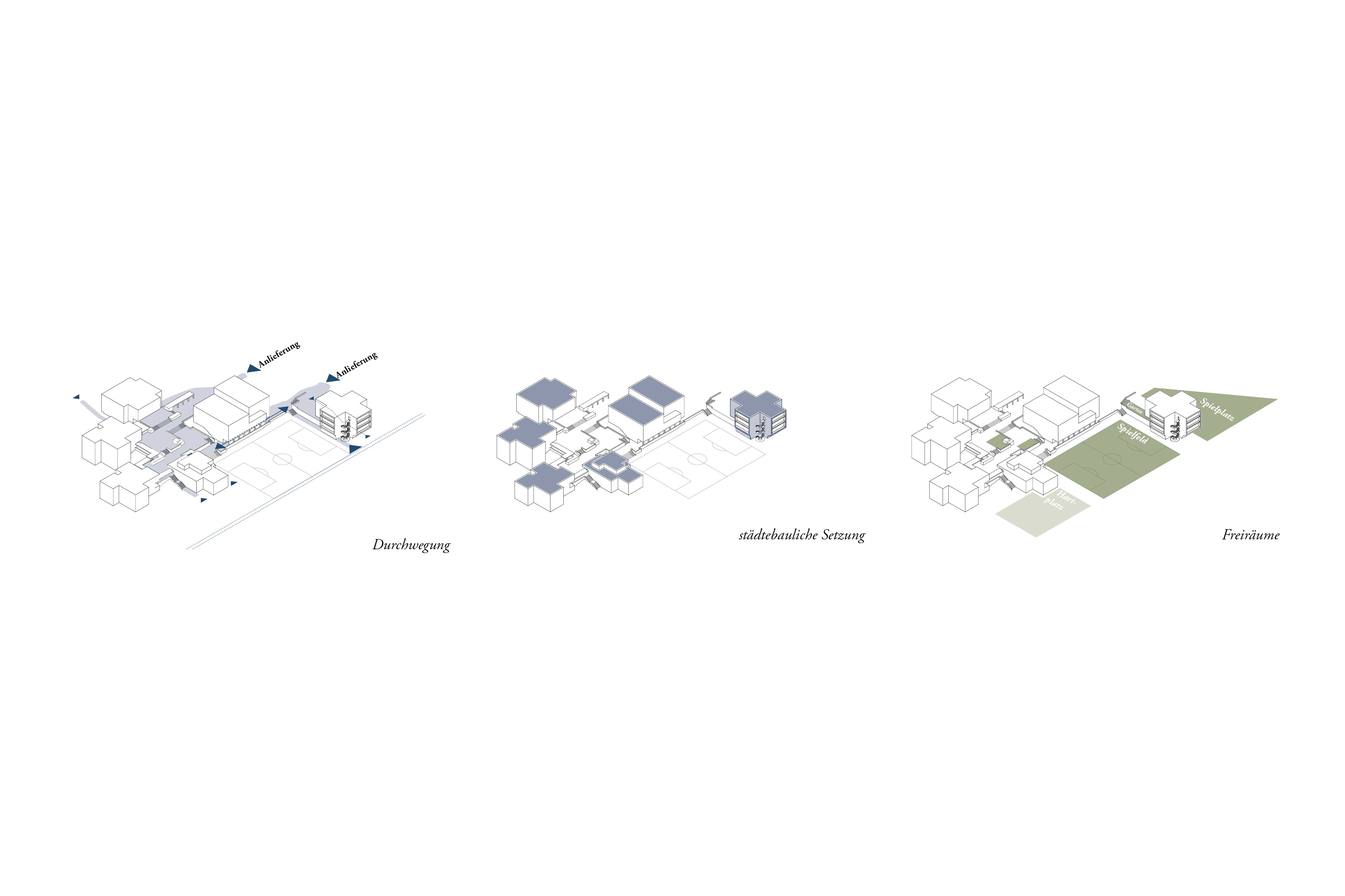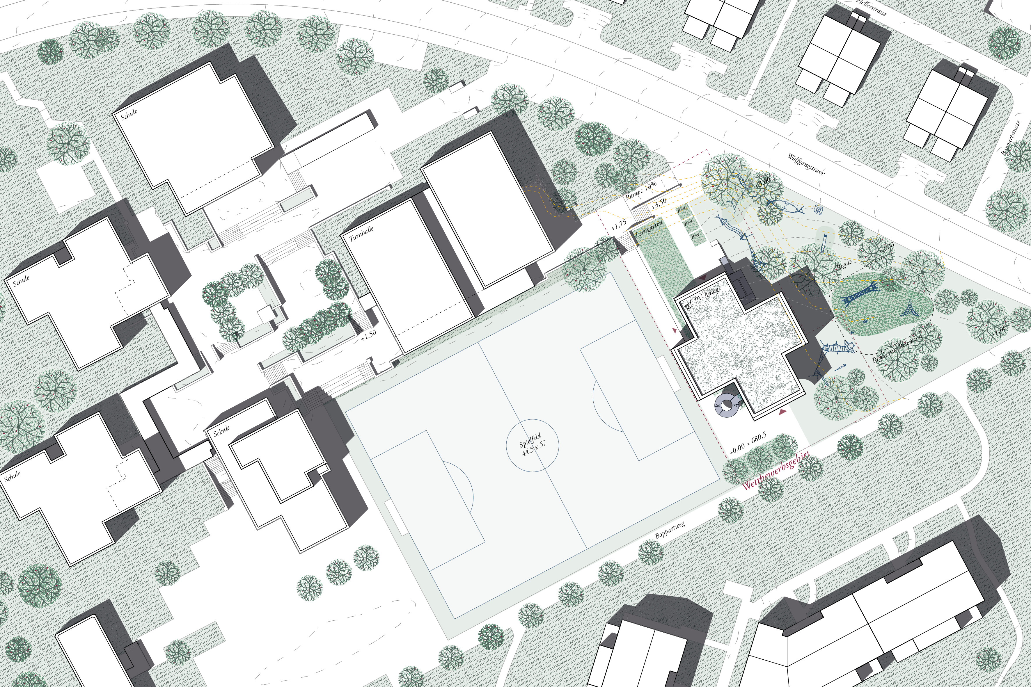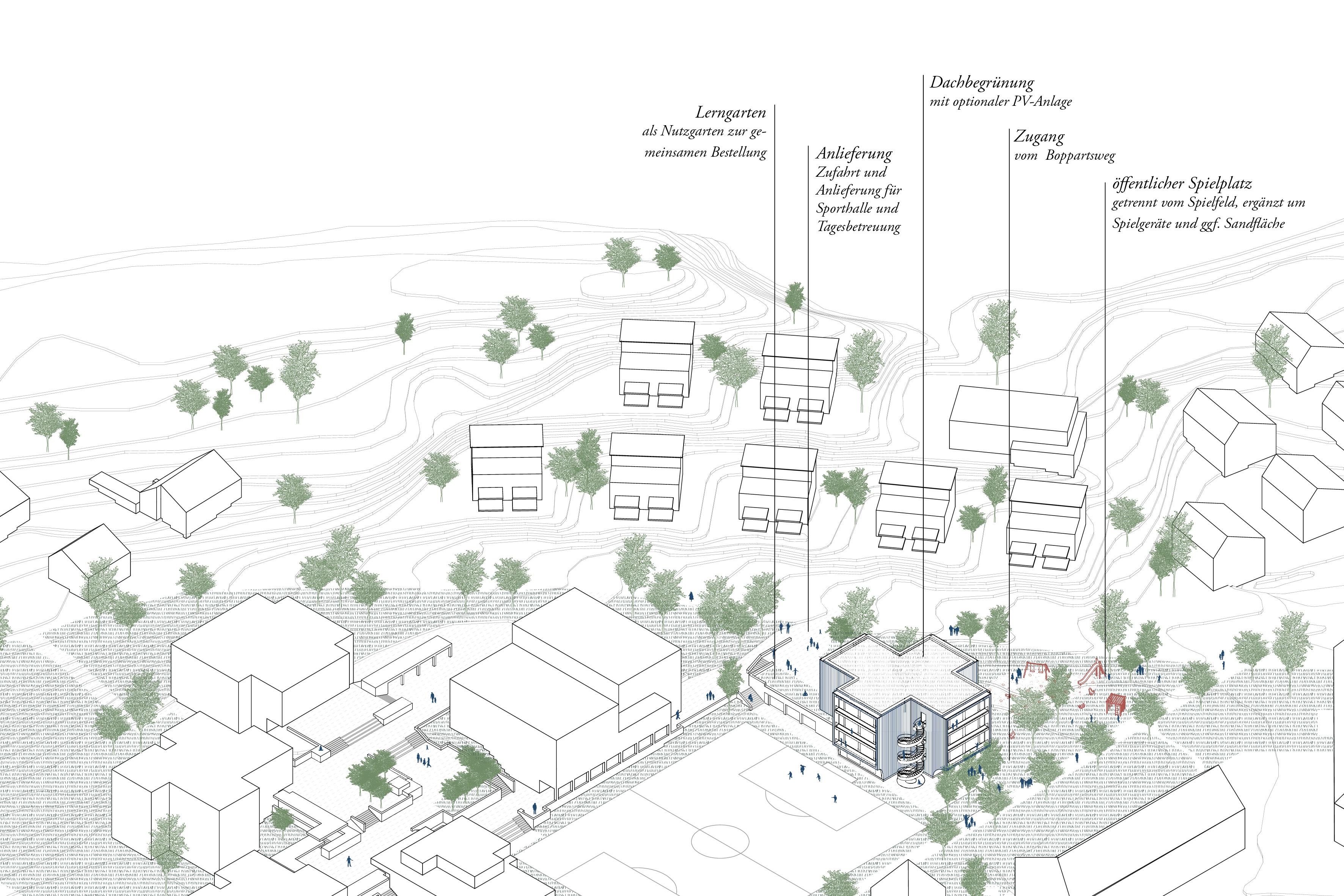 Die Schulanlage Boppartshof ist ein eigenwilliges und schönes Ensemble. Die Anlage lebt von der Einbettung in die Topographie und den sich daraus ergebenden Zwischenräumen. Die Tagesbetreuung soll in diese Bezüge eingebunden werden, nicht aber versuchen das Ensemble nachzuahmen. Bewusst verortet sich die Tagesbetreuung als blaues Wunder in der Erscheinung in einer anderen Zeit, übersetzt und übernimmt aber die Grundgedanken und räumlichen Qualitäten der Anlage und setzt baulich auf einen ökologischeren Ansatz. Für Fremde, Anwohnerinnen sowie Schülerinnen sind Zugänge und Bezüge spürbar ohne Schilder, Mauern oder Zäune.