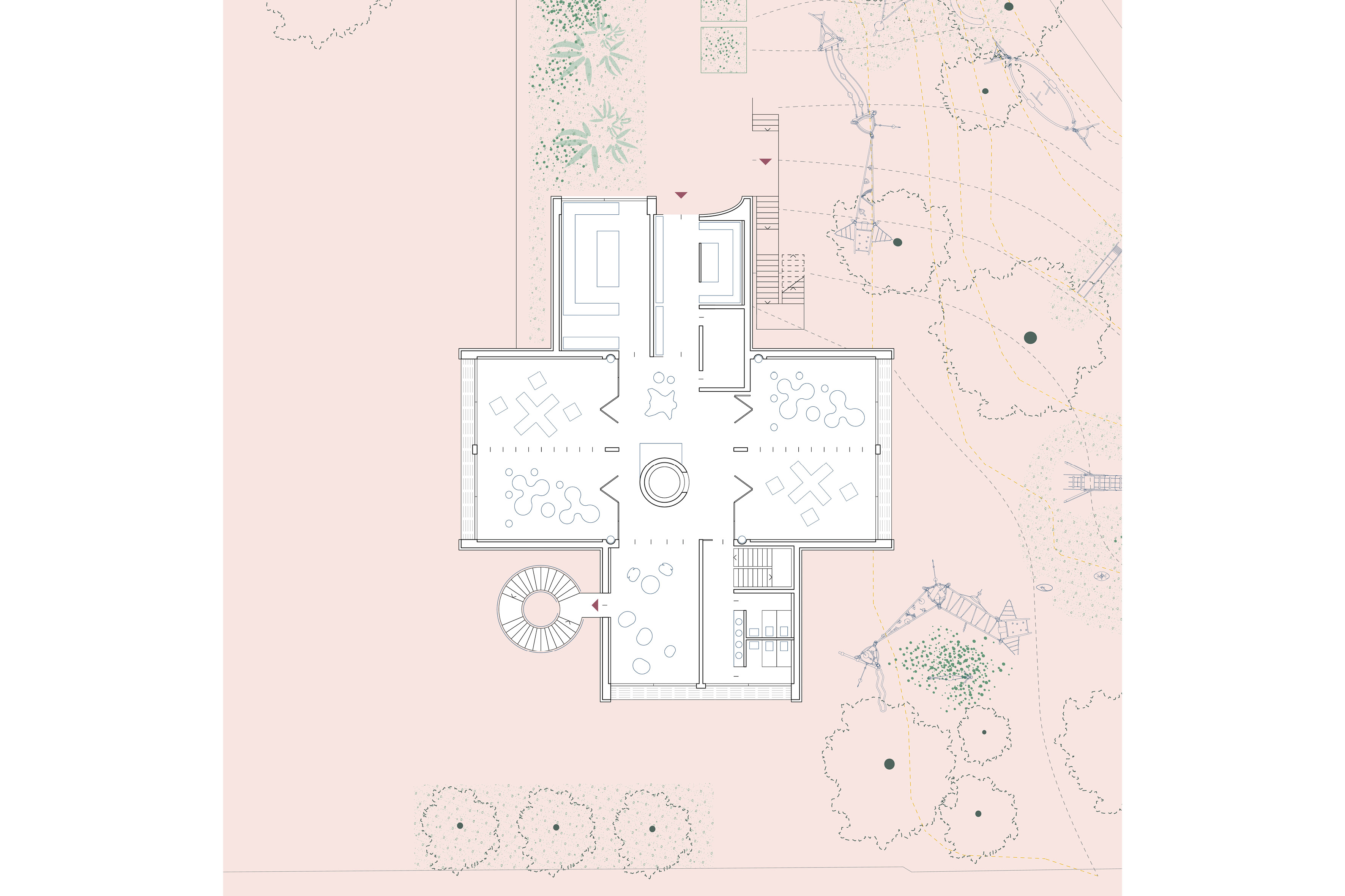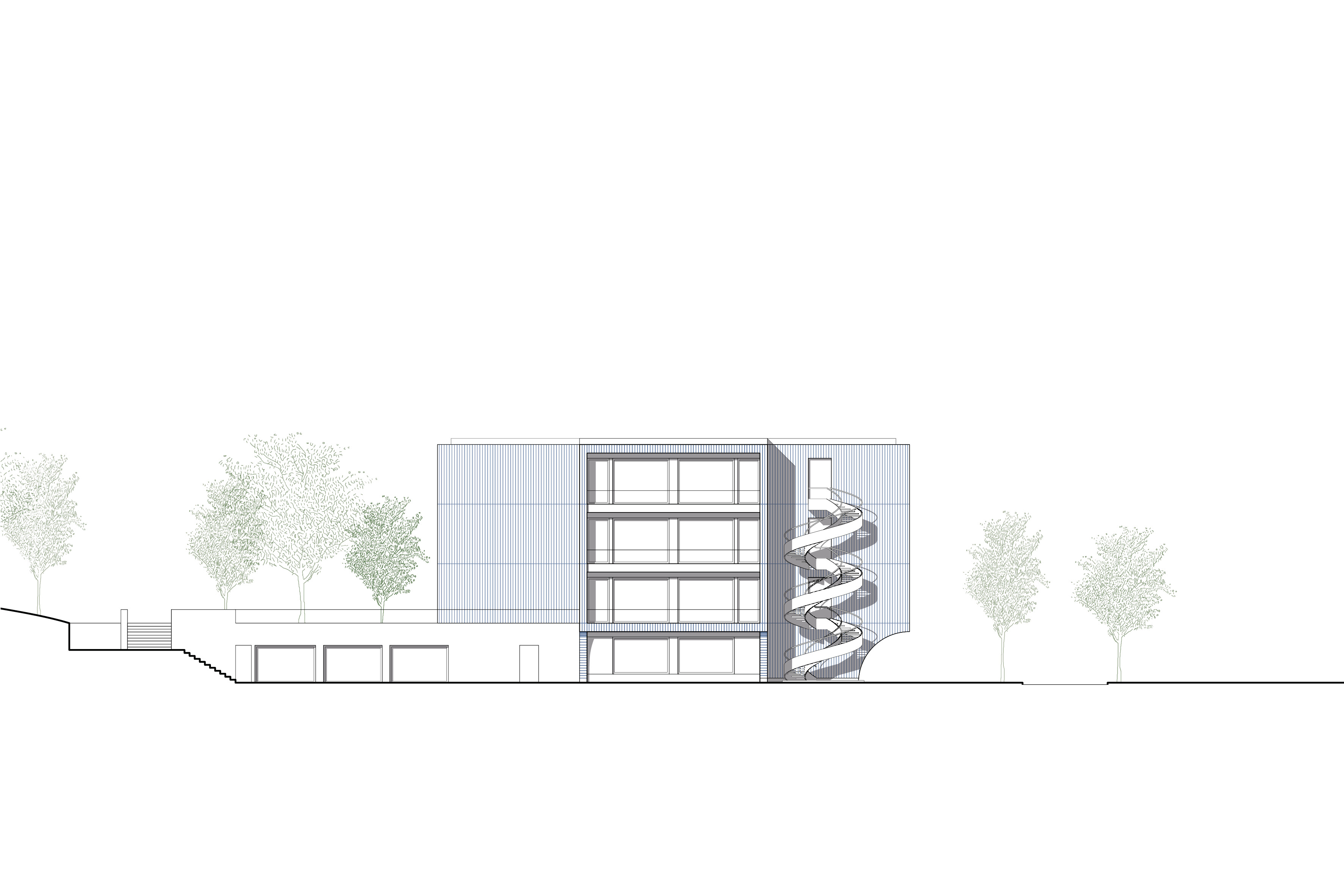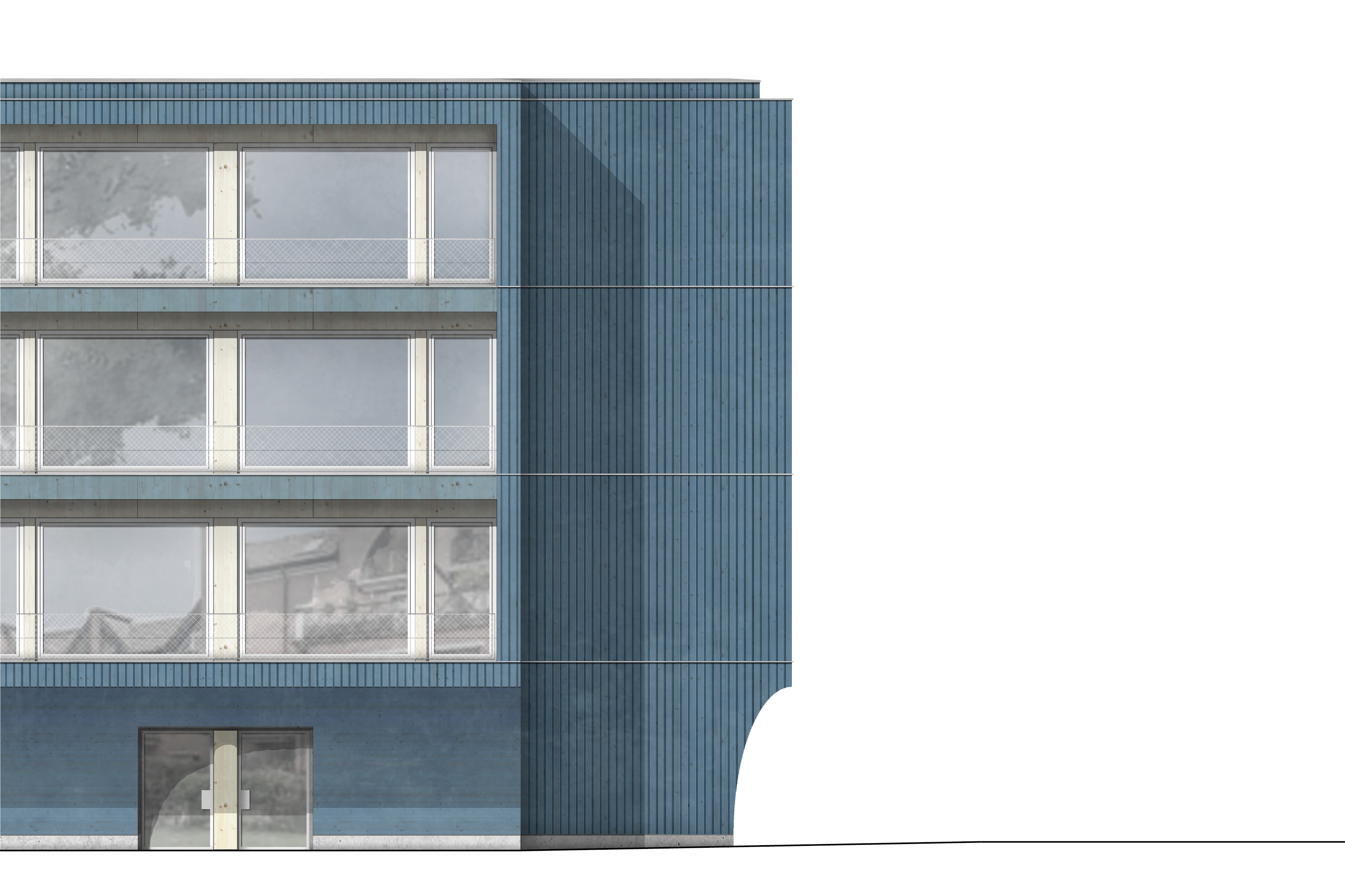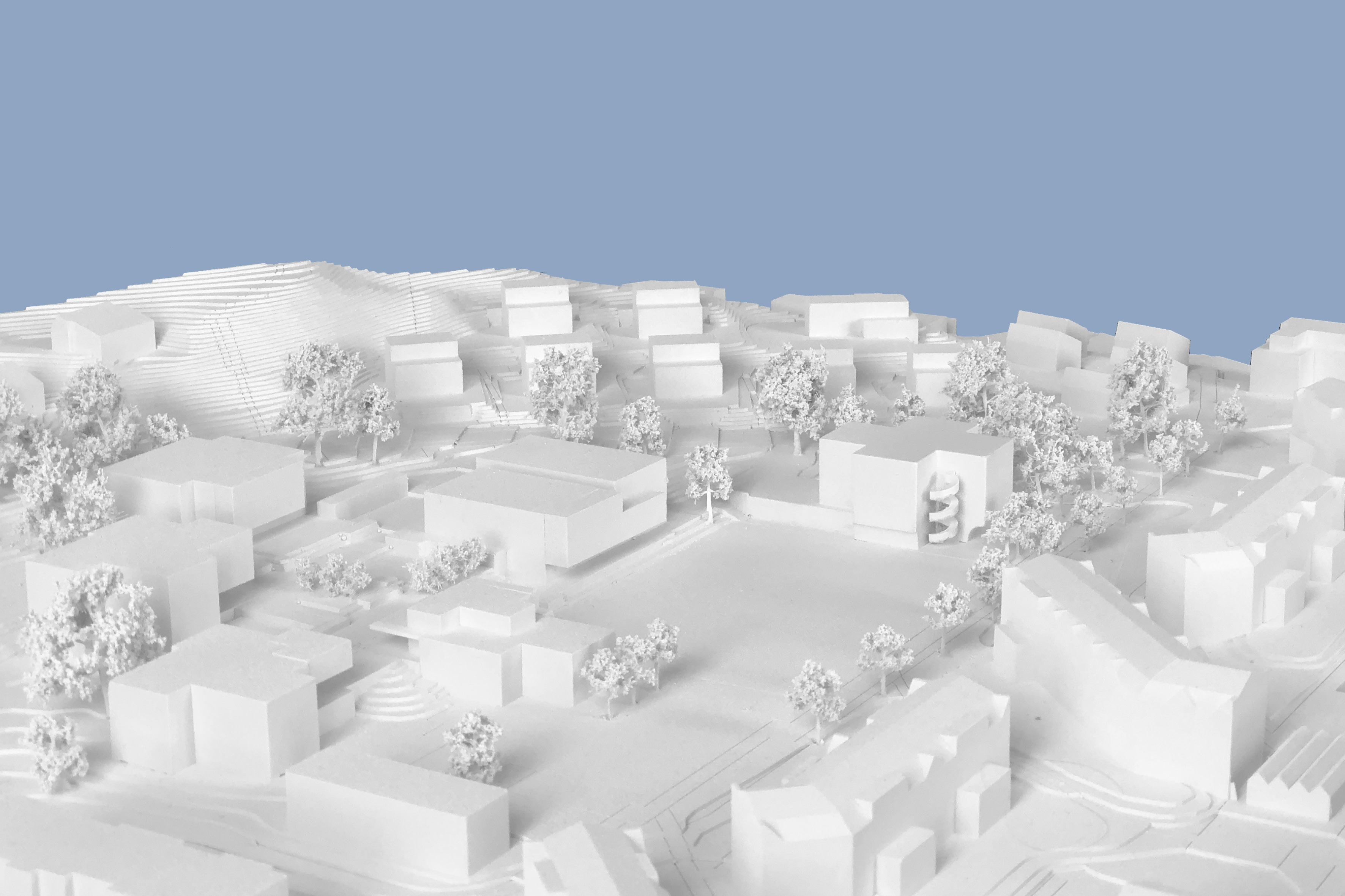 Die Schulanlage Boppartshof ist ein eigenwilliges und schönes Ensemble. Die Anlage lebt von der Einbettung in die Topographie und den sich daraus ergebenden Zwischenräumen. Die Tagesbetreuung soll in diese Bezüge eingebunden werden, nicht aber versuchen das Ensemble nachzuahmen. Bewusst verortet sich die Tagesbetreuung als blaues Wunder in der Erscheinung in einer anderen Zeit, übersetzt und übernimmt aber die Grundgedanken und räumlichen Qualitäten der Anlage und setzt baulich auf einen ökologischeren Ansatz. Für Fremde, Anwohnerinnen sowie Schülerinnen sind Zugänge und Bezüge spürbar ohne Schilder, Mauern oder Zäune.