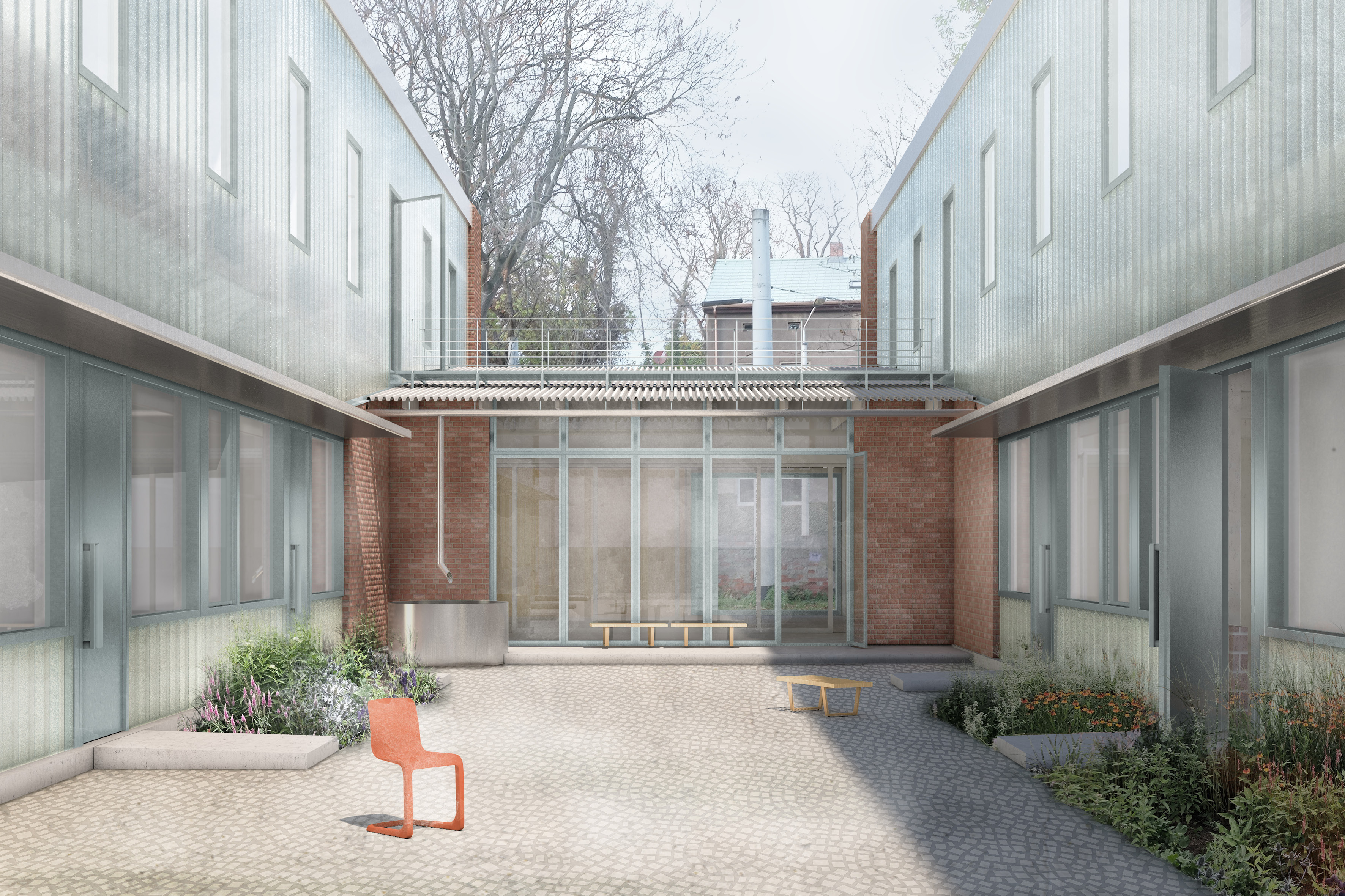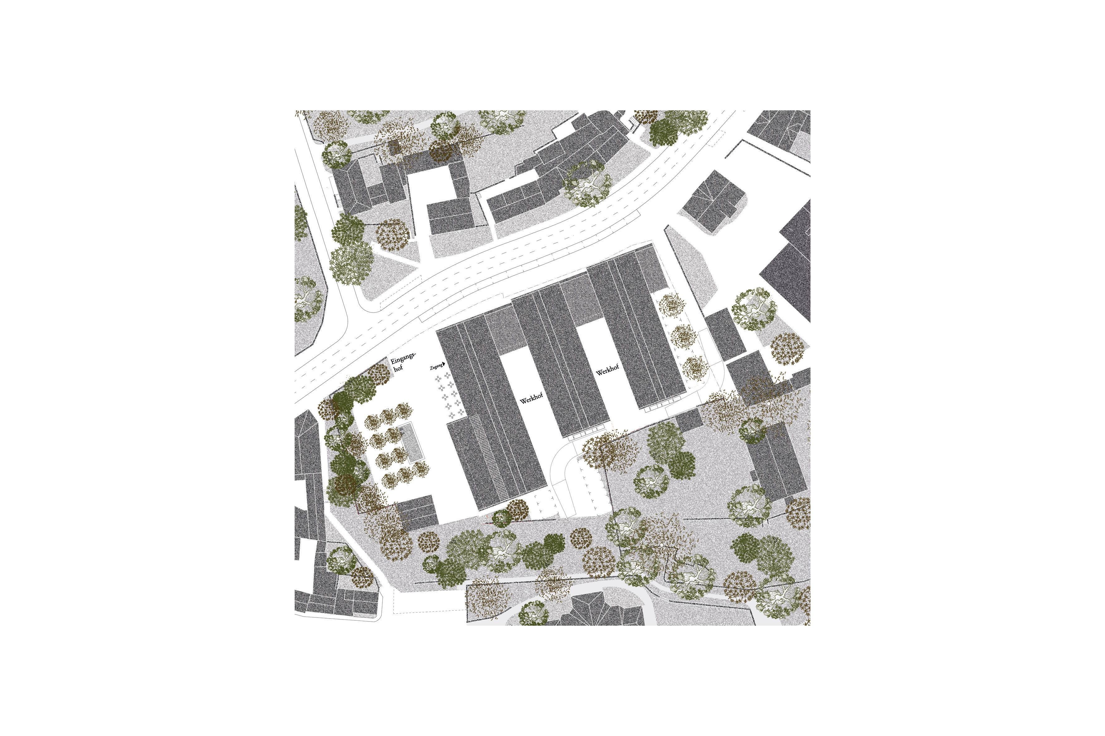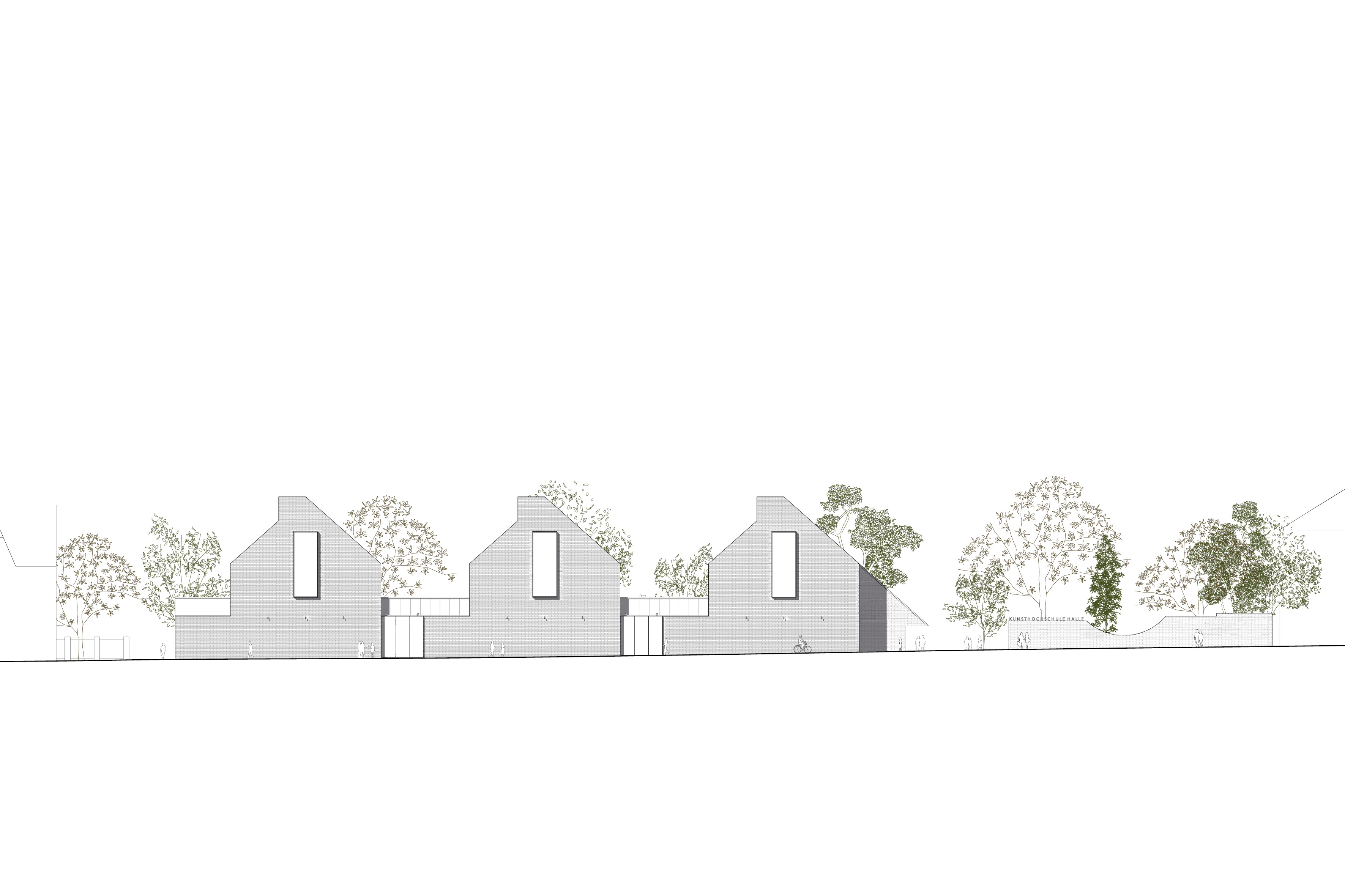 Neben der städtebaulichen Einfügung zielt der Entwurf auch auf eine inhaltlich übergeordnete. Die Volumen oszillieren in der Materialität zwischen Anpassung und Eigenständigkeit. In ihrer Kombination wecken sie Assoziationen von Werkstatt, Industrie und Produktion. Sie bilden einen Arbeitsort und knüpfen dabei an die Spuren, die die Industrialisierung im 19. Jahrhundert in Halle hinterlassen hat, an, zum Beispiel die ehemaligen Gaswerke am Holzplatz. Industriebauten großen Maßstabes mit Ziegelfassaden prägen den Charakter Halles. Als Anknüpfung daran soll ein Arbeitsort gebildet werden, der neben besten Lichtverhältnissen, fein gestalteten Aufenthaltsbereichen und einladenden Werkhöfen, die nötige Ruppigkeit besitzt, um von Lehrenden und Studierenden zugleich angeeignet, genutzt und belebt zu werden.