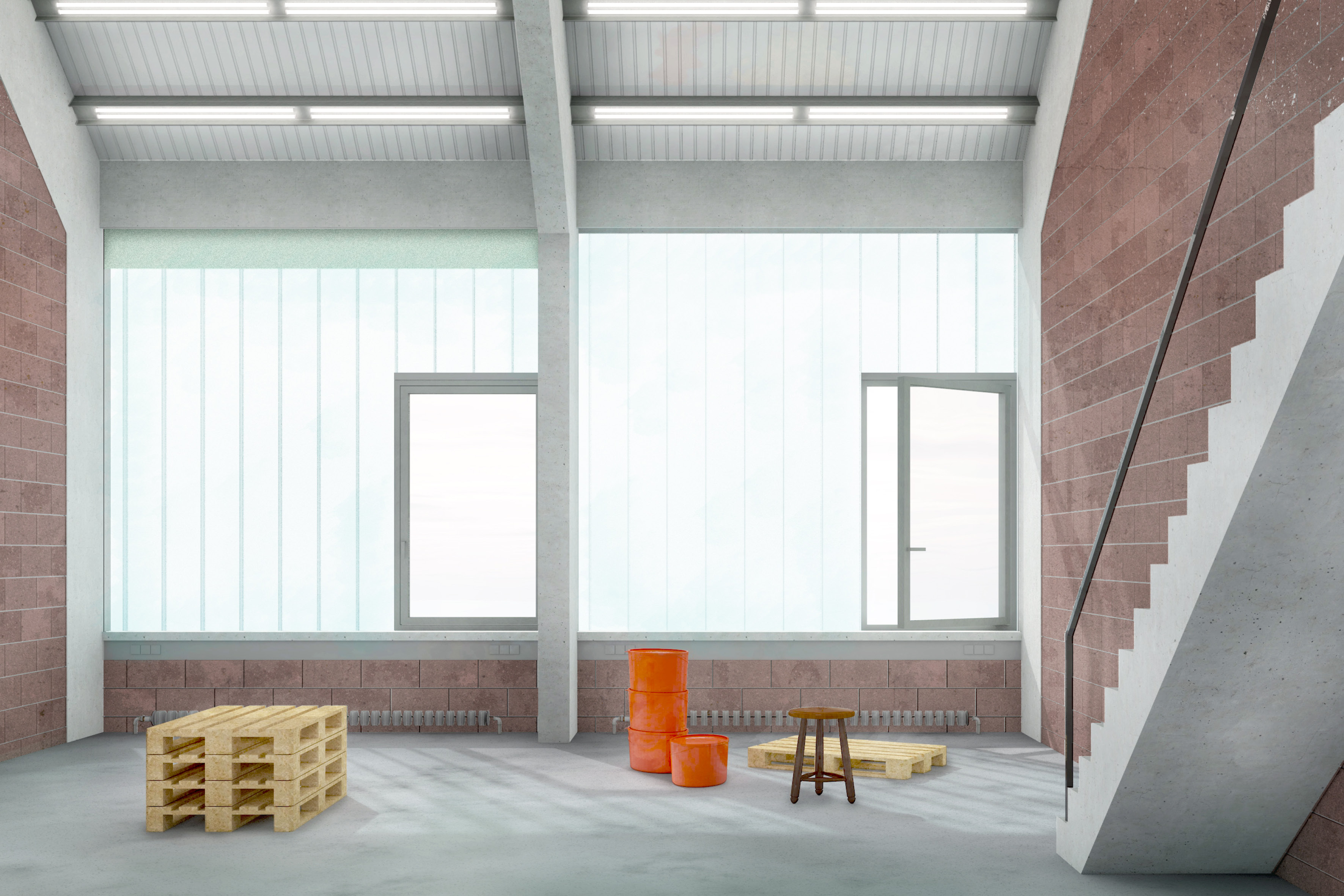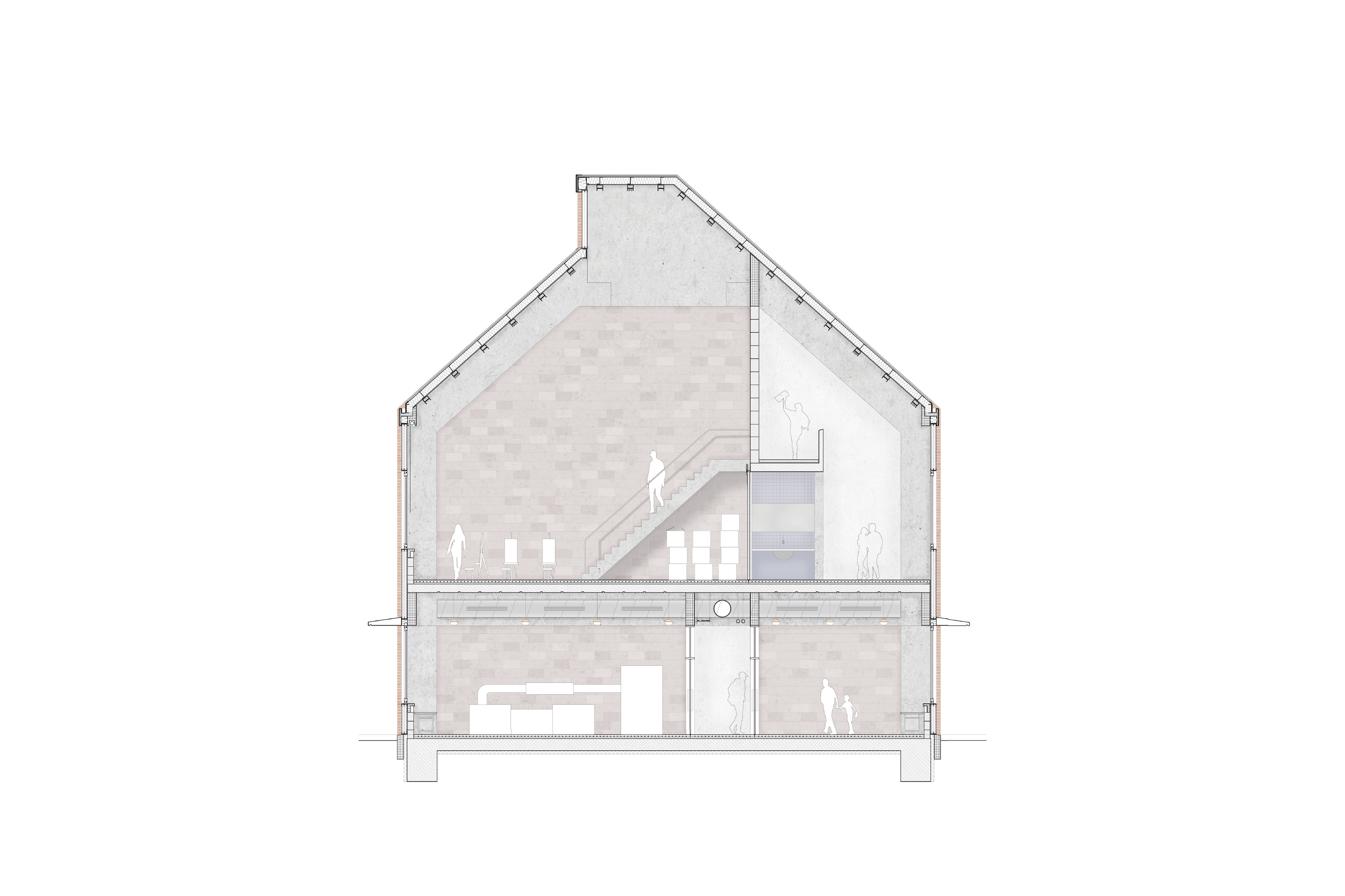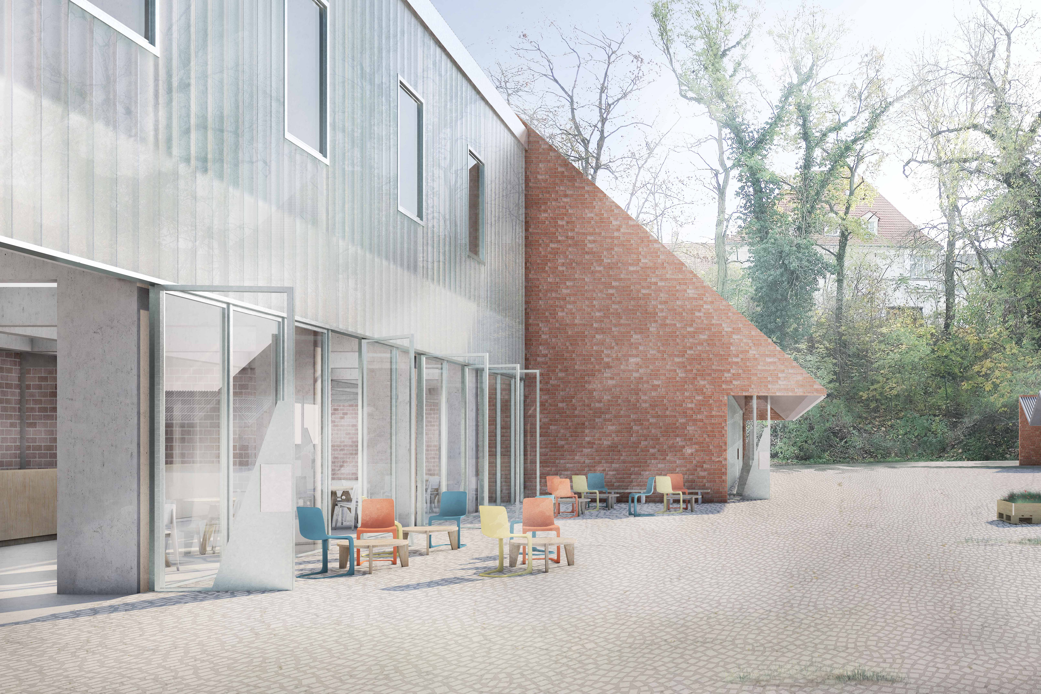 Neben der städtebaulichen Einfügung zielt der Entwurf auch auf eine inhaltlich übergeordnete. Die Volumen oszillieren in der Materialität zwischen Anpassung und Eigenständigkeit. In ihrer Kombination wecken sie Assoziationen von Werkstatt, Industrie und Produktion. Sie bilden einen Arbeitsort und knüpfen dabei an die Spuren, die die Industrialisierung im 19. Jahrhundert in Halle hinterlassen hat, an, zum Beispiel die ehemaligen Gaswerke am Holzplatz. Industriebauten großen Maßstabes mit Ziegelfassaden prägen den Charakter Halles. Als Anknüpfung daran soll ein Arbeitsort gebildet werden, der neben besten Lichtverhältnissen, fein gestalteten Aufenthaltsbereichen und einladenden Werkhöfen, die nötige Ruppigkeit besitzt, um von Lehrenden und Studierenden zugleich angeeignet, genutzt und belebt zu werden.
