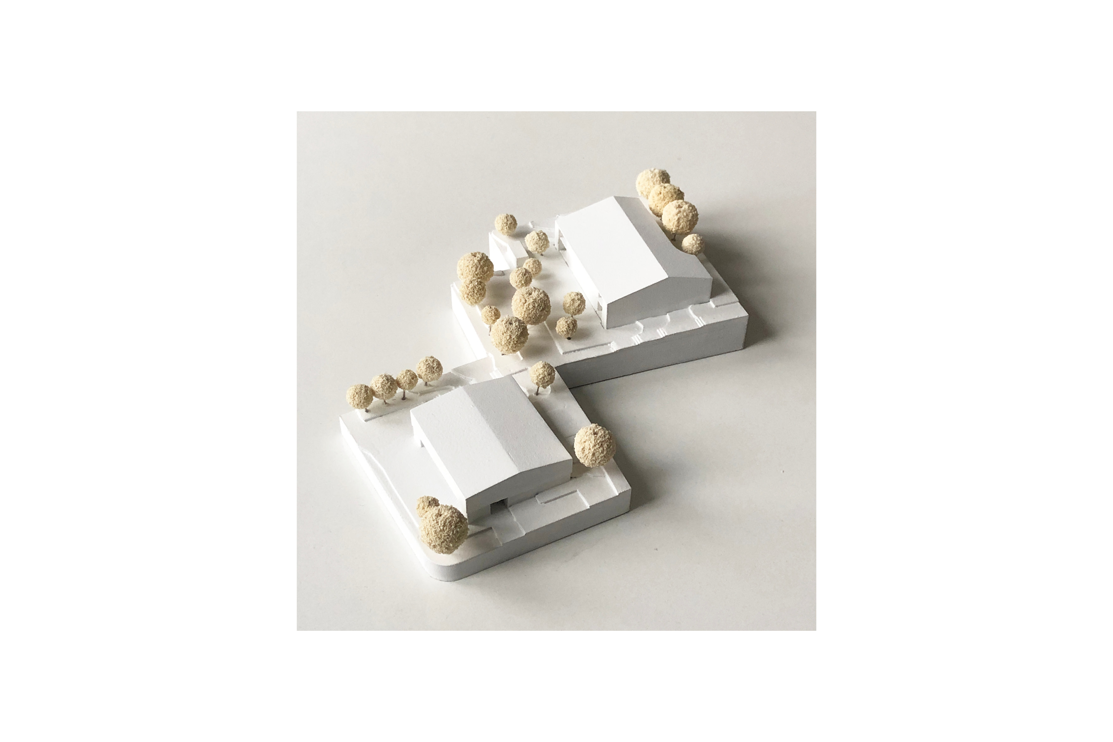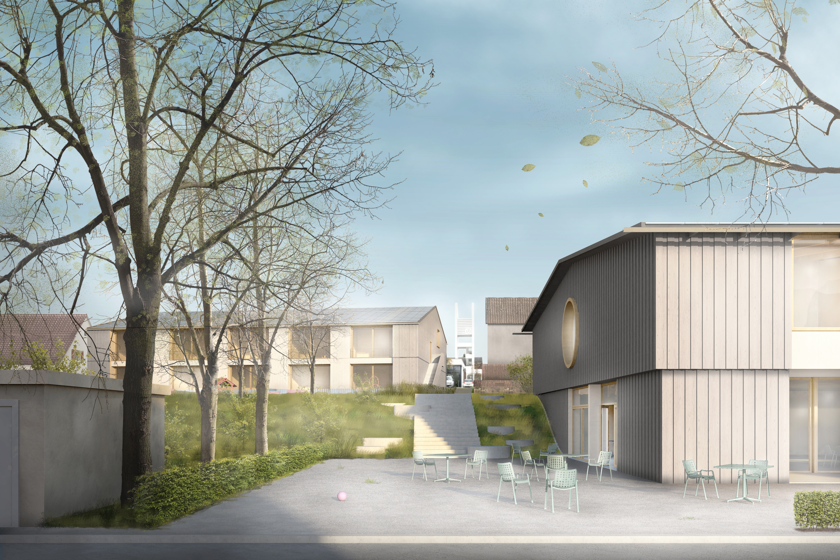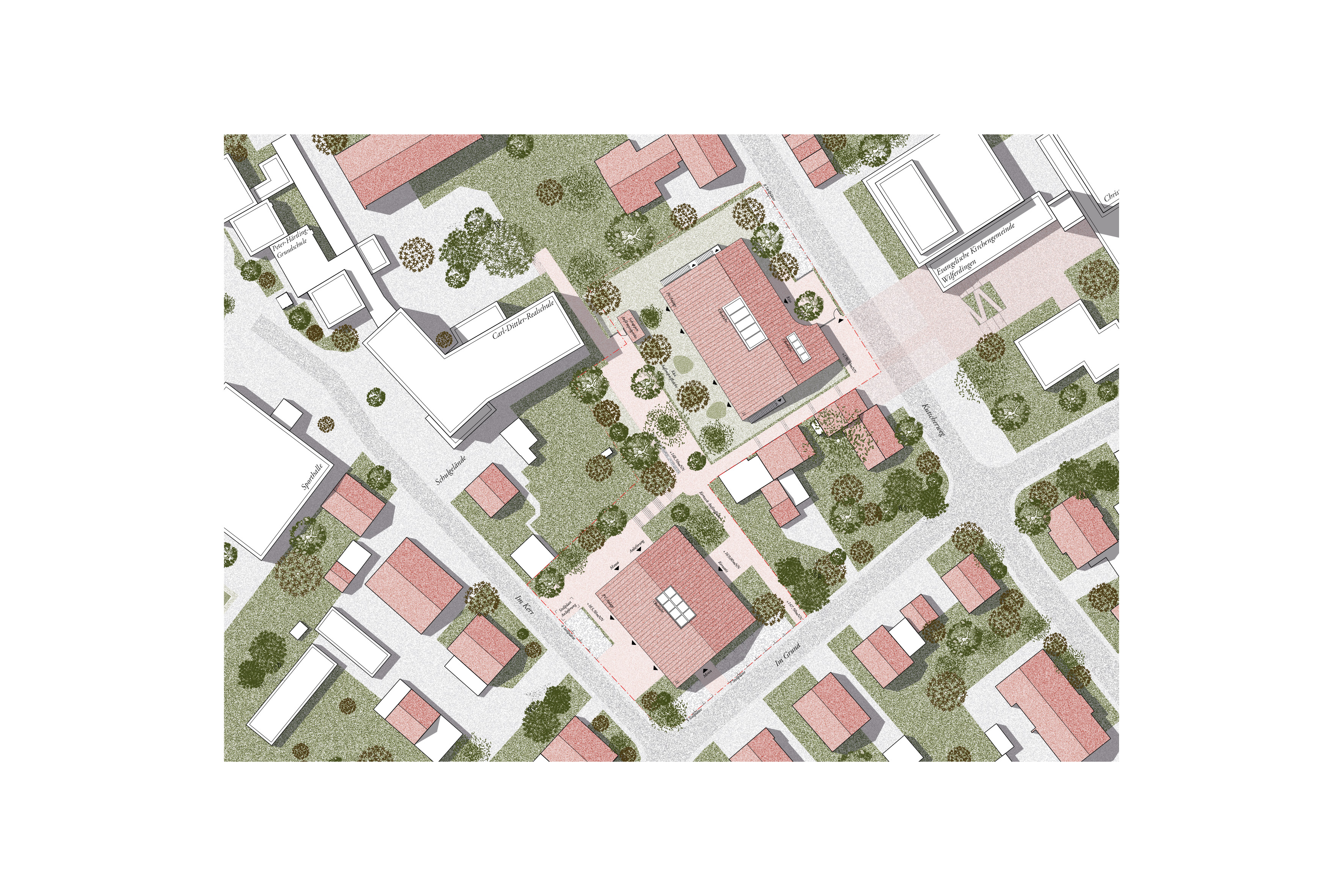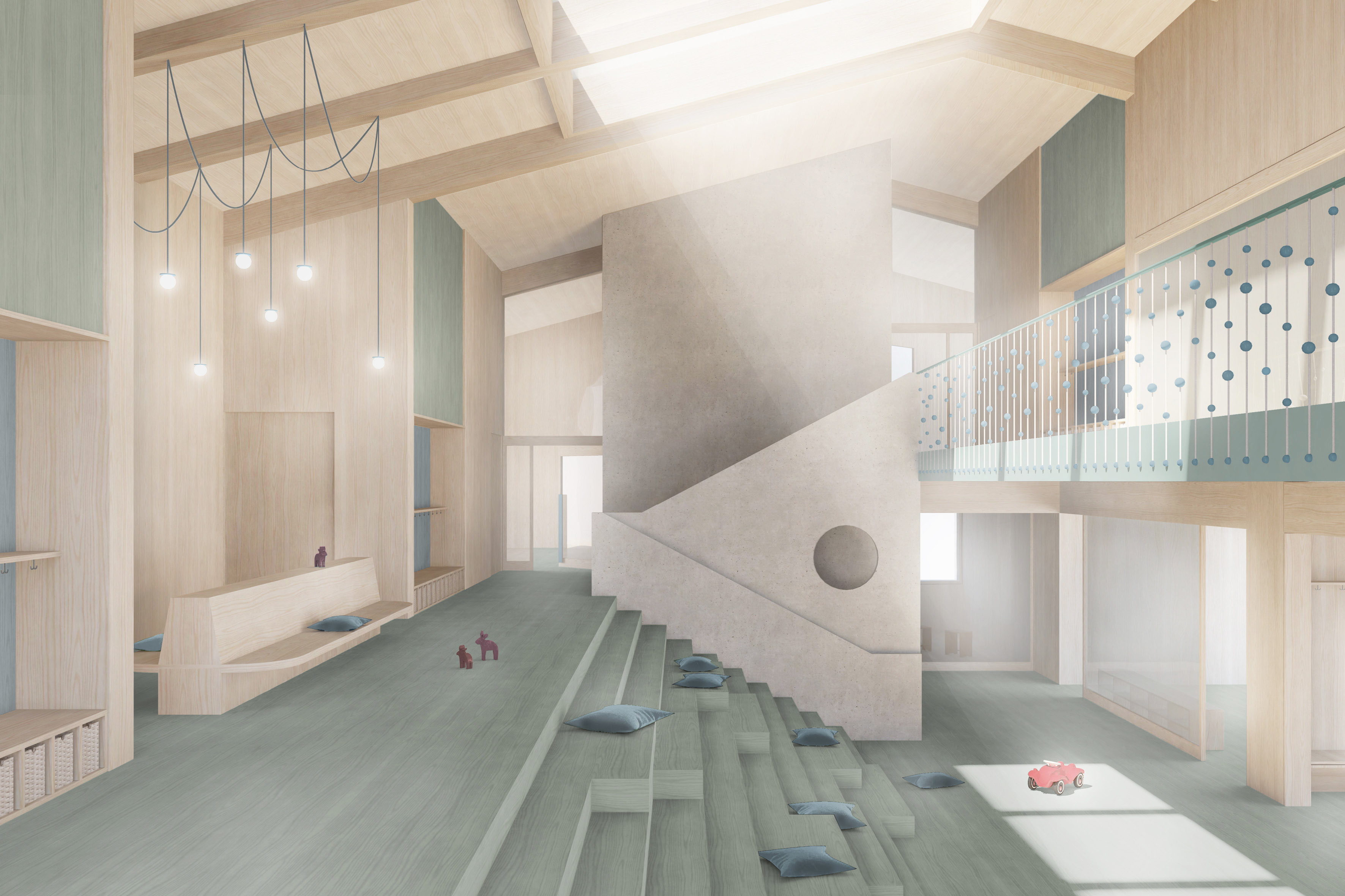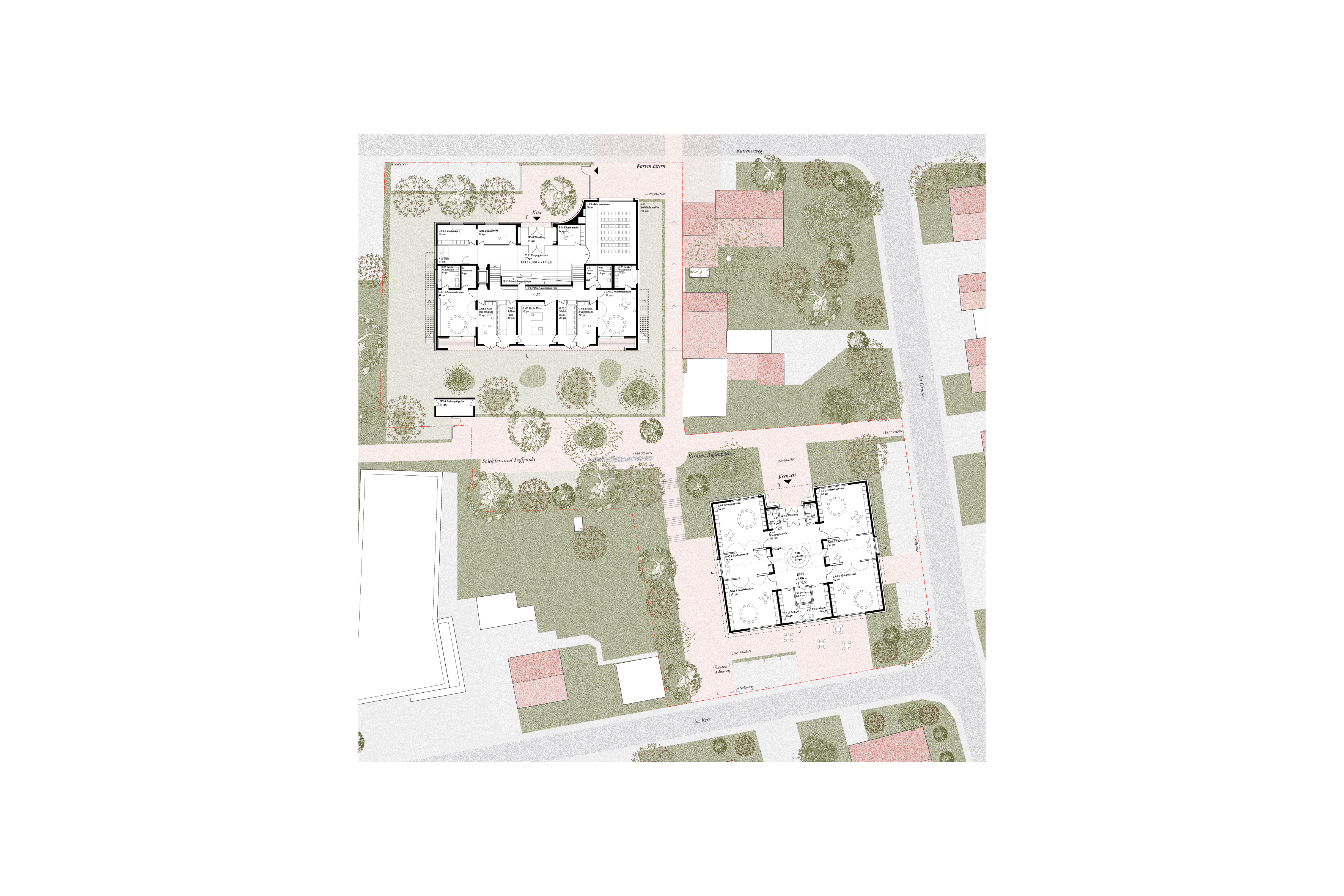 Eingebettet in ein heterogenes Wohngebiet fügen sich zwei Volumen feinfühlig ein. Die Topographie wird zum bestimmenden Thema. So erzeugt sie für die Kita ein Splitlevel, das mit einer Theatertreppe besetzt wird. Die Kernzeit und Mensa werden je ebenengleich erschlossen, weswegen auf eine bauliche Erschließung verzichtet werden kann. Beide Gebäude schöpfen aus dem umgebenden Lokalcholorit und sind als Holzbauten konzipiert.