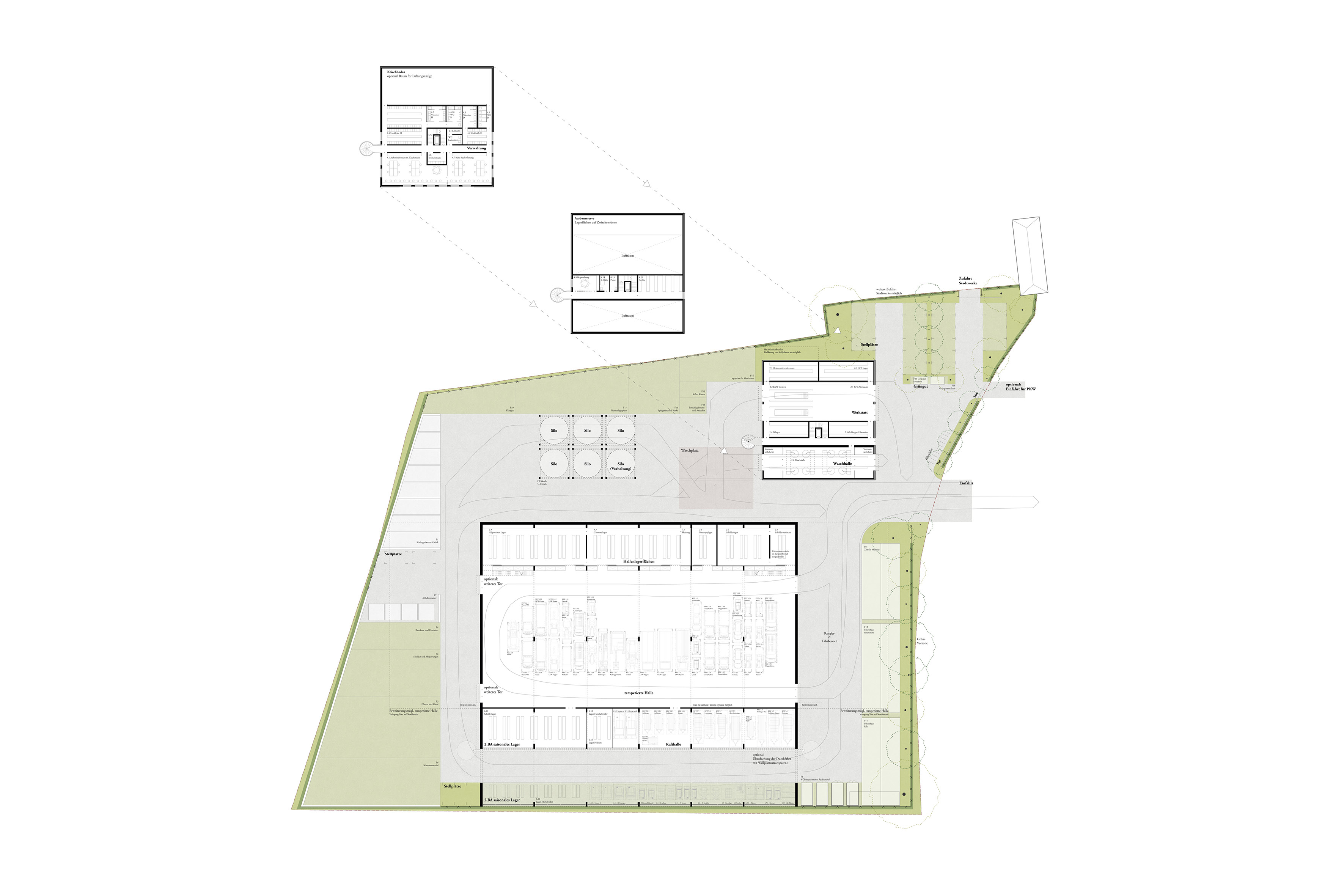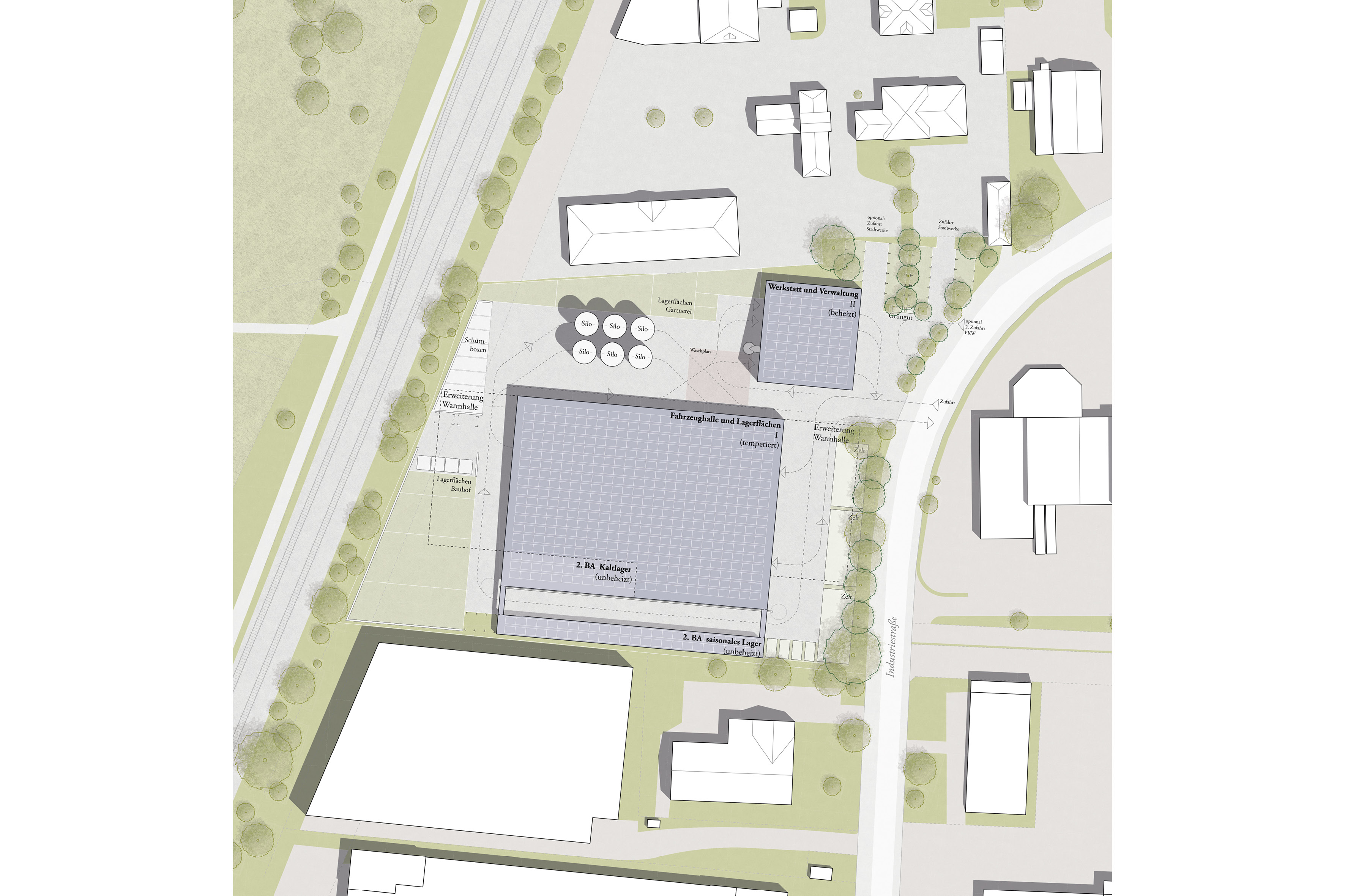 Zwei einfache Volumen werden so angeordnet, dass reibungslose Bewegungsabläufe um und in den Gebäuden möglich sind. Das flächige Haus beinhaltet alle Kraftfahrzeuge und Maschinen, außerdem die Lager. Hier ist alles auf den motorisierten Verkehr ausgerichtet. Möglichst wenig Stützen und möglichst viele Optionen für Durchfahrten gewährleisten langfristige Flexibilität. Die temperierte Halle kann Richtung Osten und Westen um je 2 Achsen erweitert werden. Das punktförmige Haus befindet sich an der Einfahrt zum Grundstück und bildet die Adresse des Bauhofes. Im Erdgeschoss befinden sich der Eingang an der Industriestraße und die Werkstätten mit Waschhalle. Im Obergeschoss sind alle Personal- und Verwaltungsräume angeordnet. Während alle Arbeitsplätze nach außen gerichtet sind, schafft die zentrale Erschließung Begegnungsort und kurze Wege zwischen den unterschiedlichen Abteilungen und zwischen den Gärtnerei- und Bauhofmitarbeitern.