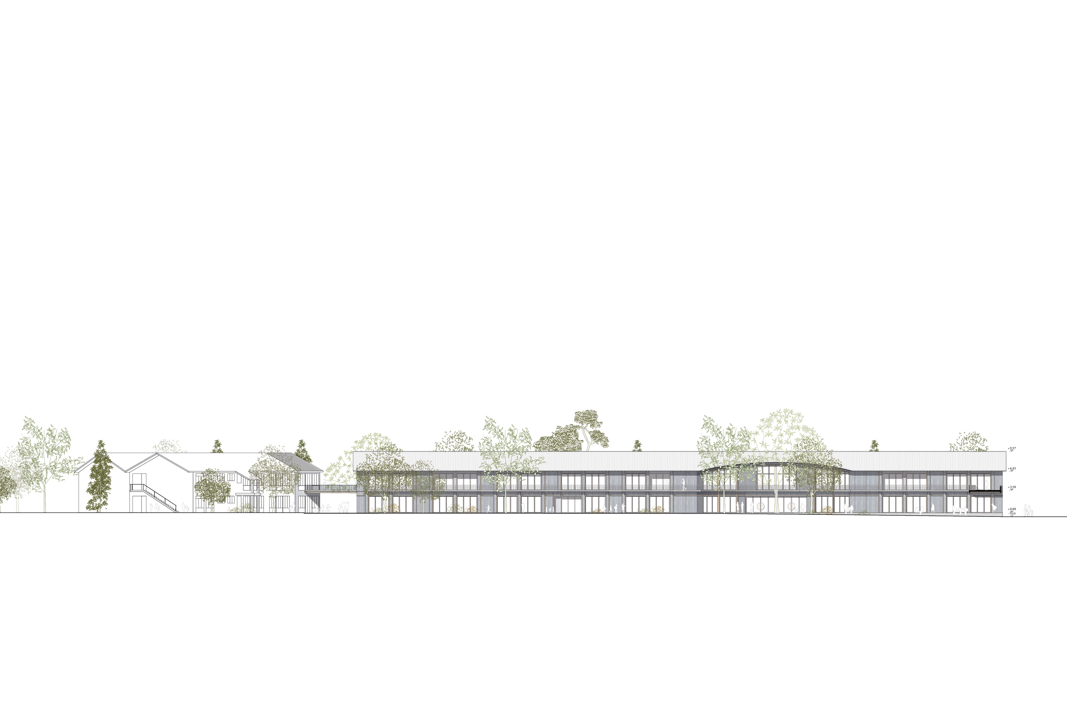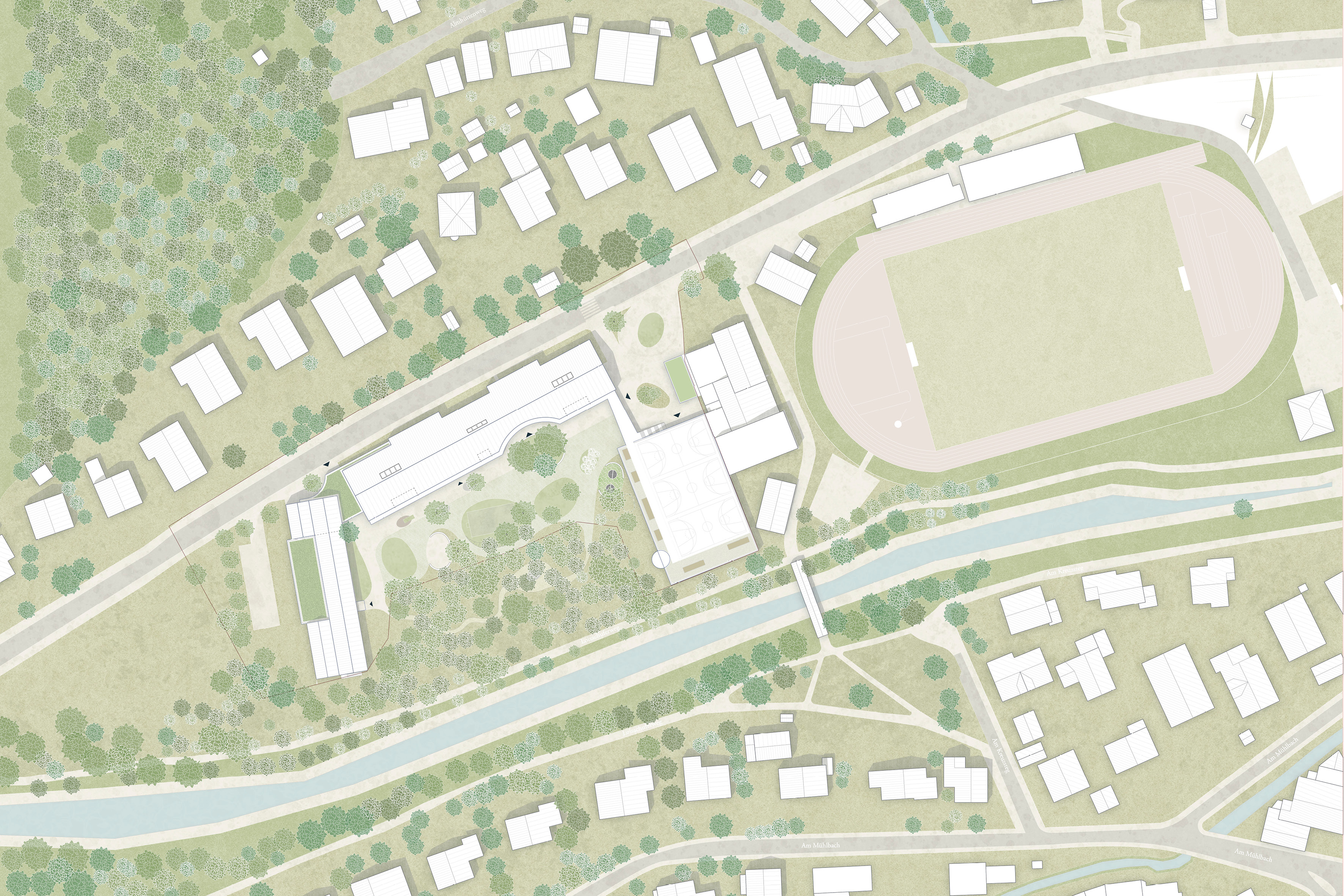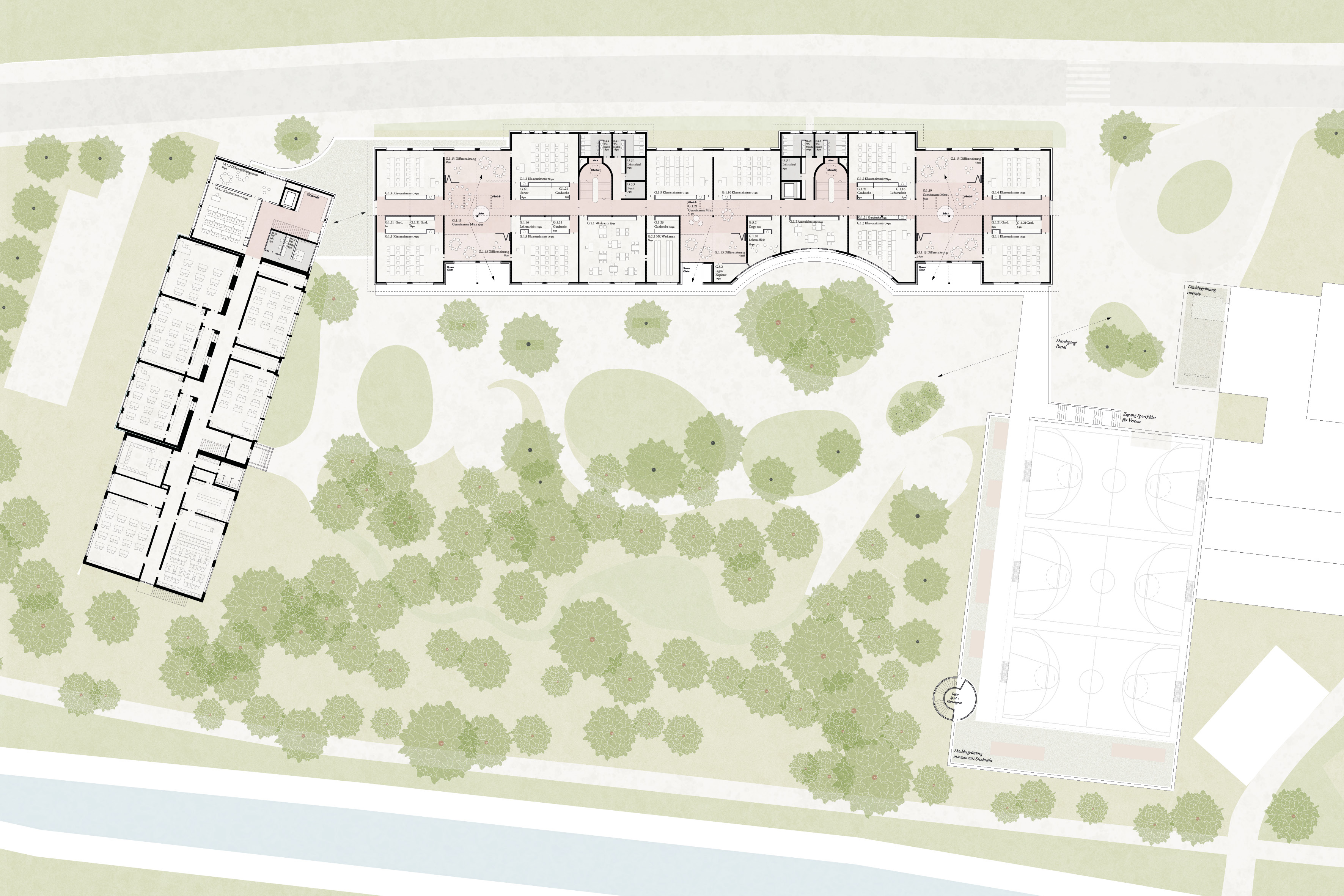 Alleinstellungsmerkmal der malerisch gelegenen Schulanlage im Gröben ist der Schulwald mit dem angrenzenden Schulhof. Der Neubau der Grundschule sitzt auf selbiger Stelle wie der Bestand. Der langestreckte Satteldachbau steht traufständig zur Straße. Um die lange Fassade zu gliedern schieben sich je zwei Achsfelder, die der Erschließung gewidmet sind in den Straßenraum und rhythmisieren diesen. Entlang der gesamten Südseite spannt ein Balkon sich auf der im Osten als Brückenbau im Og auf das Dach der Sporthalle führt. Damit markiert sich ein Portal, dass den Übergang zwischen Vorplatz und Pausenhof klar zoniert. Um das gestaltprägende Ensemble der 3 Bäume im Pausenhof zu schützen wird der Abstand um die Kronen eingehalten. Dies führt zu einem Einschnitt in den Baukörper, der den Haupteingang zur Grundschule akzentuiert und verortet. Bewusst liegt dieser auf der Pausenhofseite.