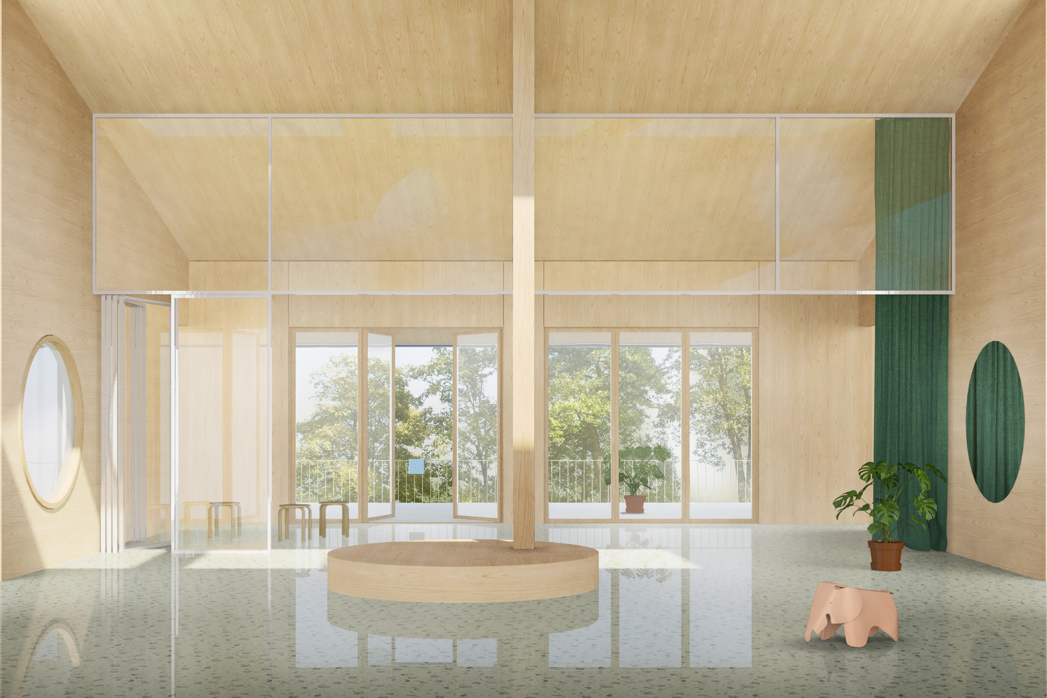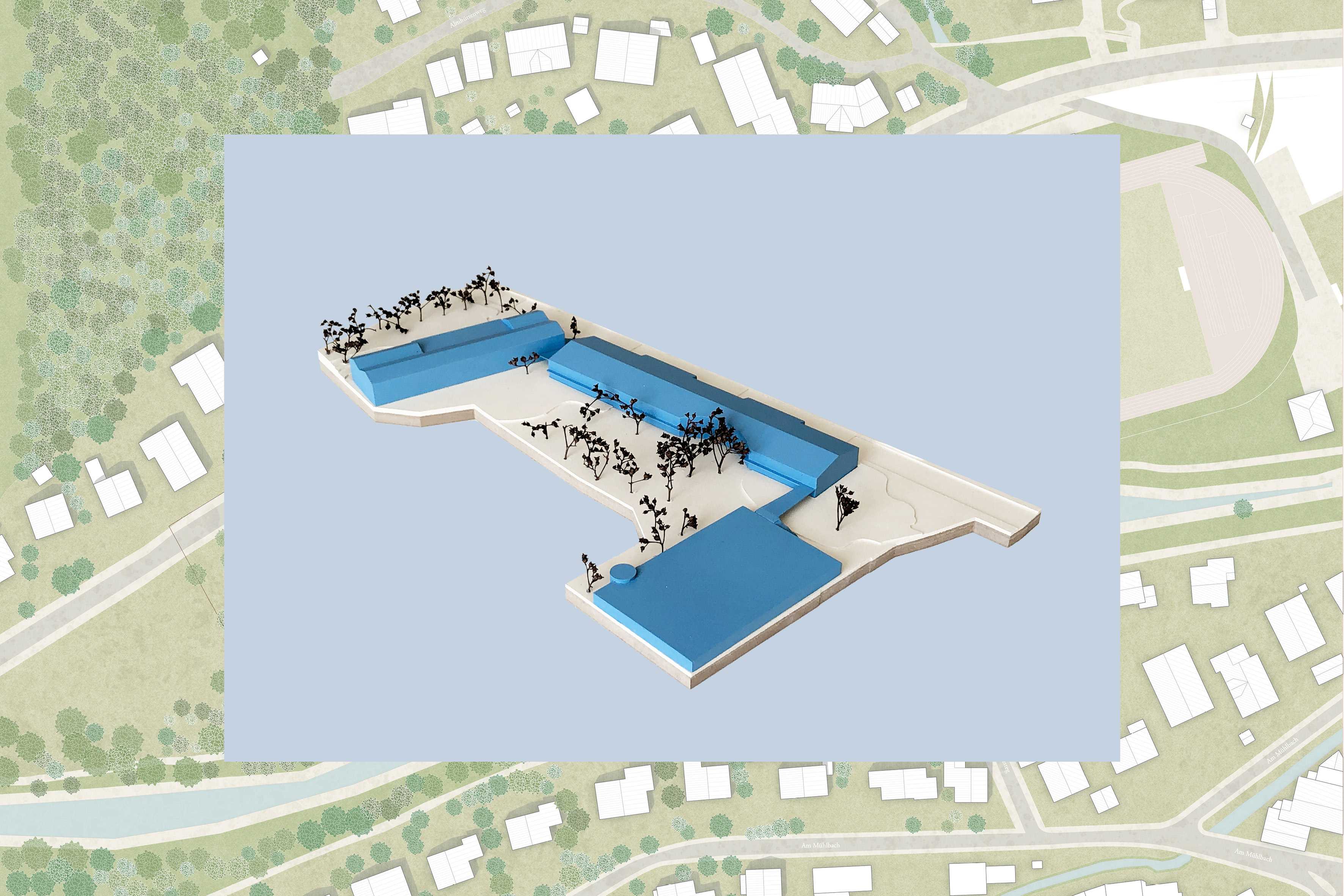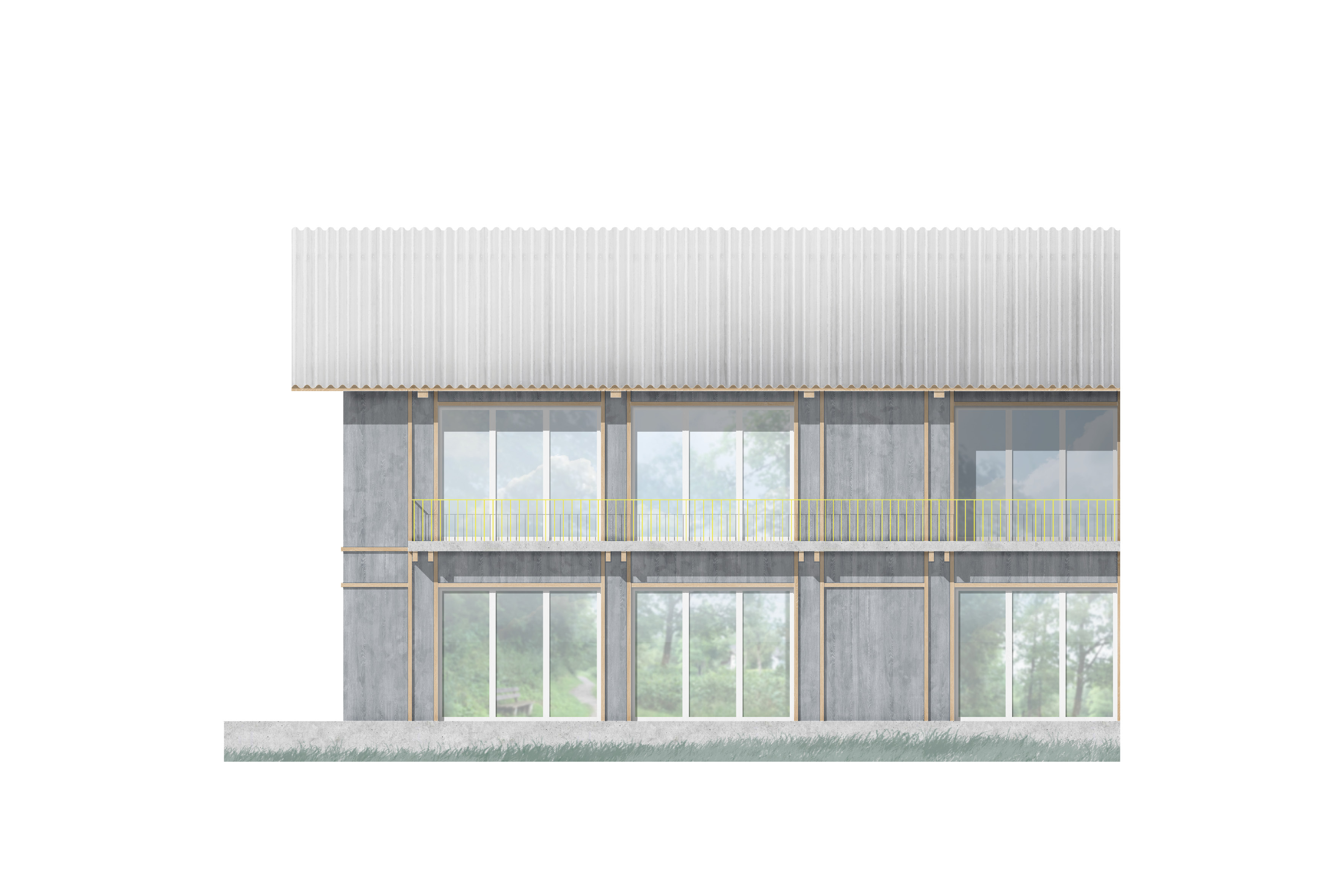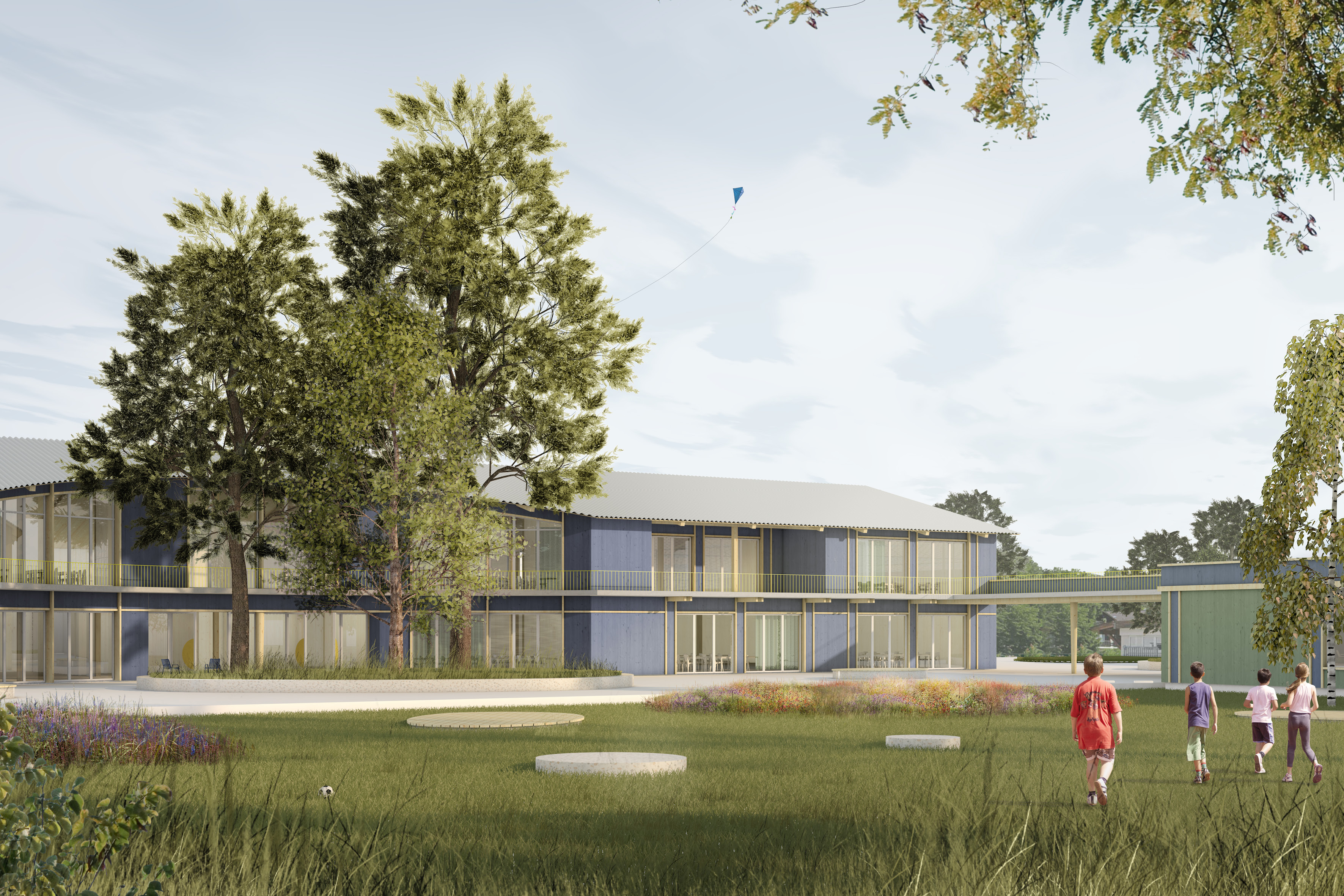 Alleinstellungsmerkmal der malerisch gelegenen Schulanlage im Gröben ist der Schulwald mit dem angrenzenden Schulhof. Der Neubau der Grundschule sitzt auf selbiger Stelle wie der Bestand. Der langestreckte Satteldachbau steht traufständig zur Straße. Um die lange Fassade zu gliedern schieben sich je zwei Achsfelder, die der Erschließung gewidmet sind in den Straßenraum und rhythmisieren diesen. Entlang der gesamten Südseite spannt ein Balkon sich auf der im Osten als Brückenbau im Og auf das Dach der Sporthalle führt. Damit markiert sich ein Portal, dass den Übergang zwischen Vorplatz und Pausenhof klar zoniert. Um das gestaltprägende Ensemble der 3 Bäume im Pausenhof zu schützen wird der Abstand um die Kronen eingehalten. Dies führt zu einem Einschnitt in den Baukörper, der den Haupteingang zur Grundschule akzentuiert und verortet. Bewusst liegt dieser auf der Pausenhofseite.