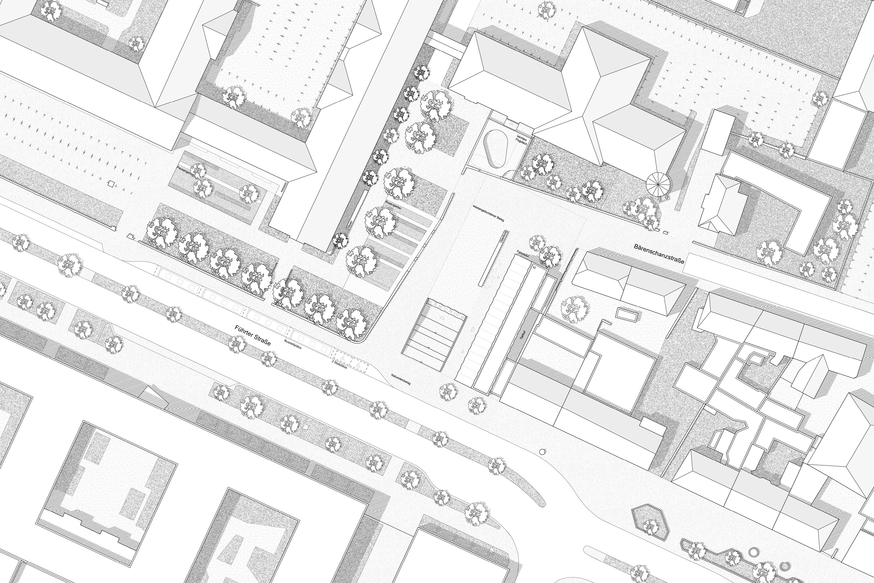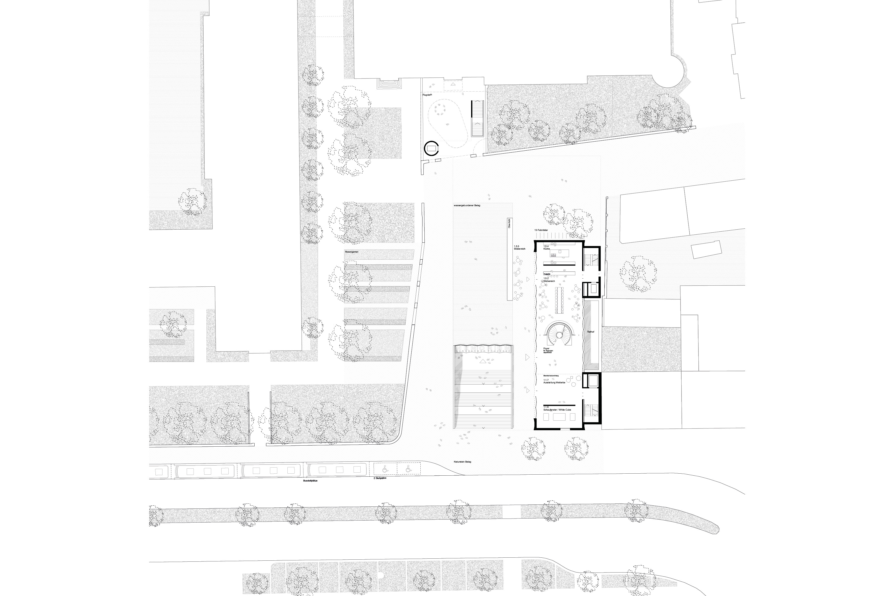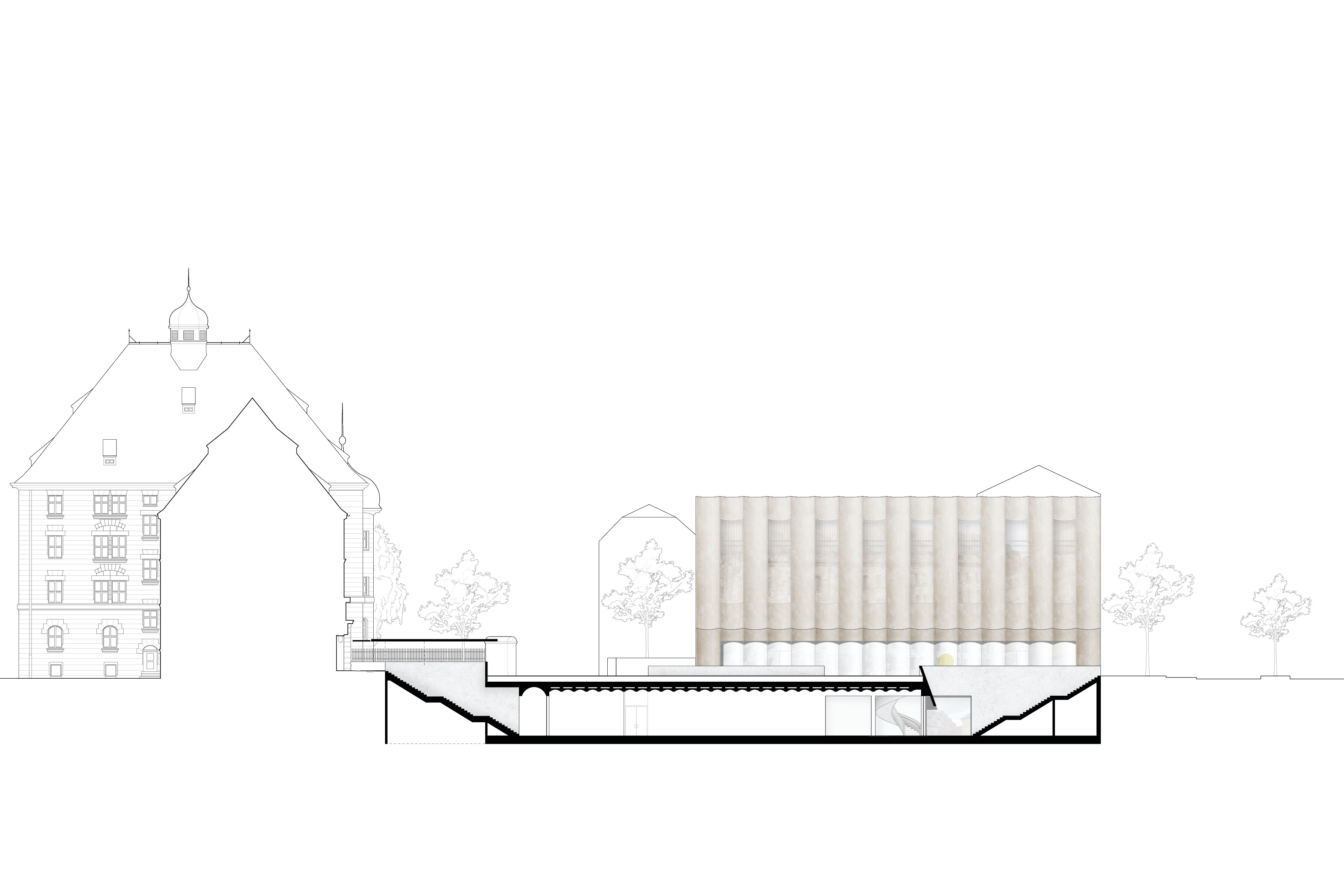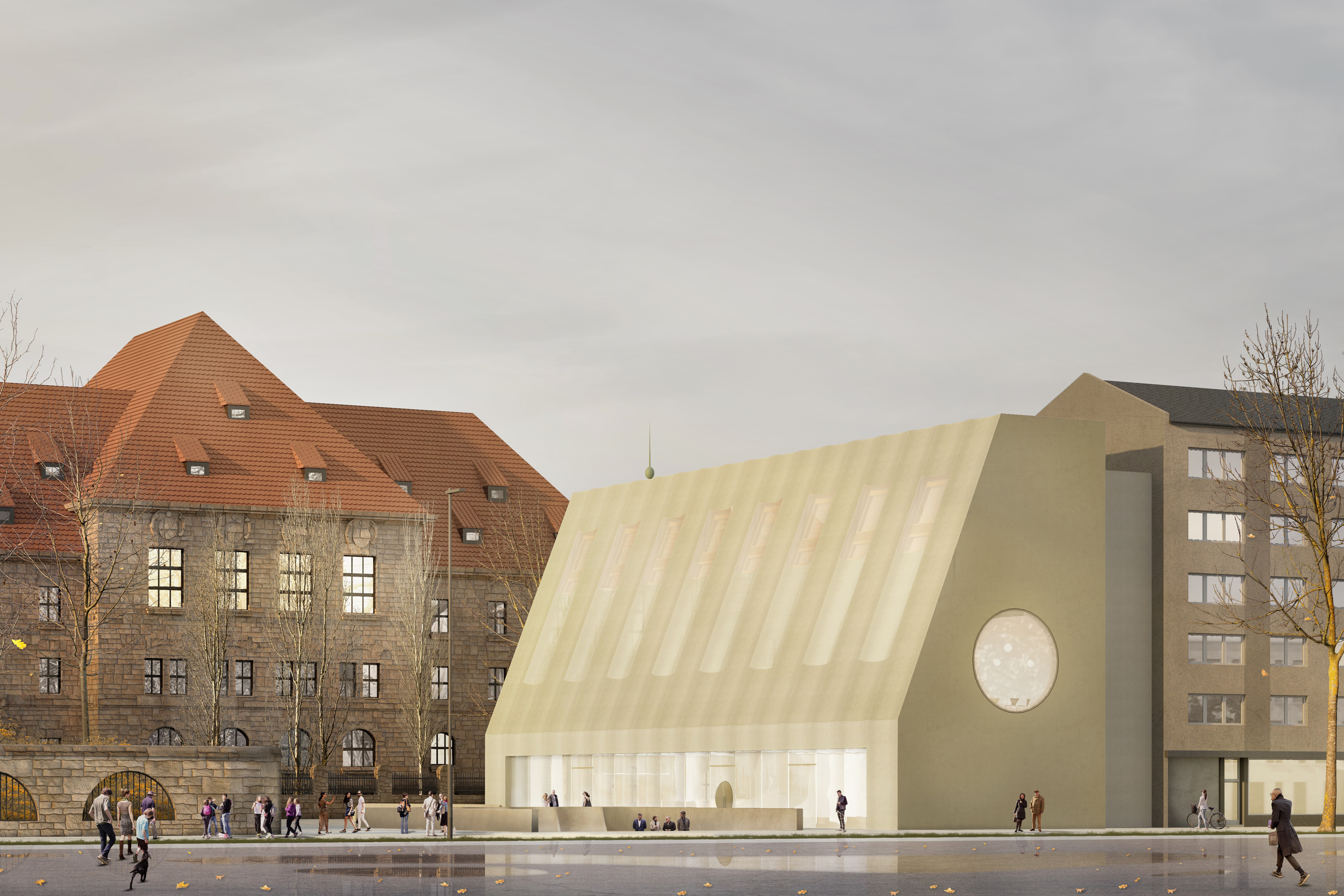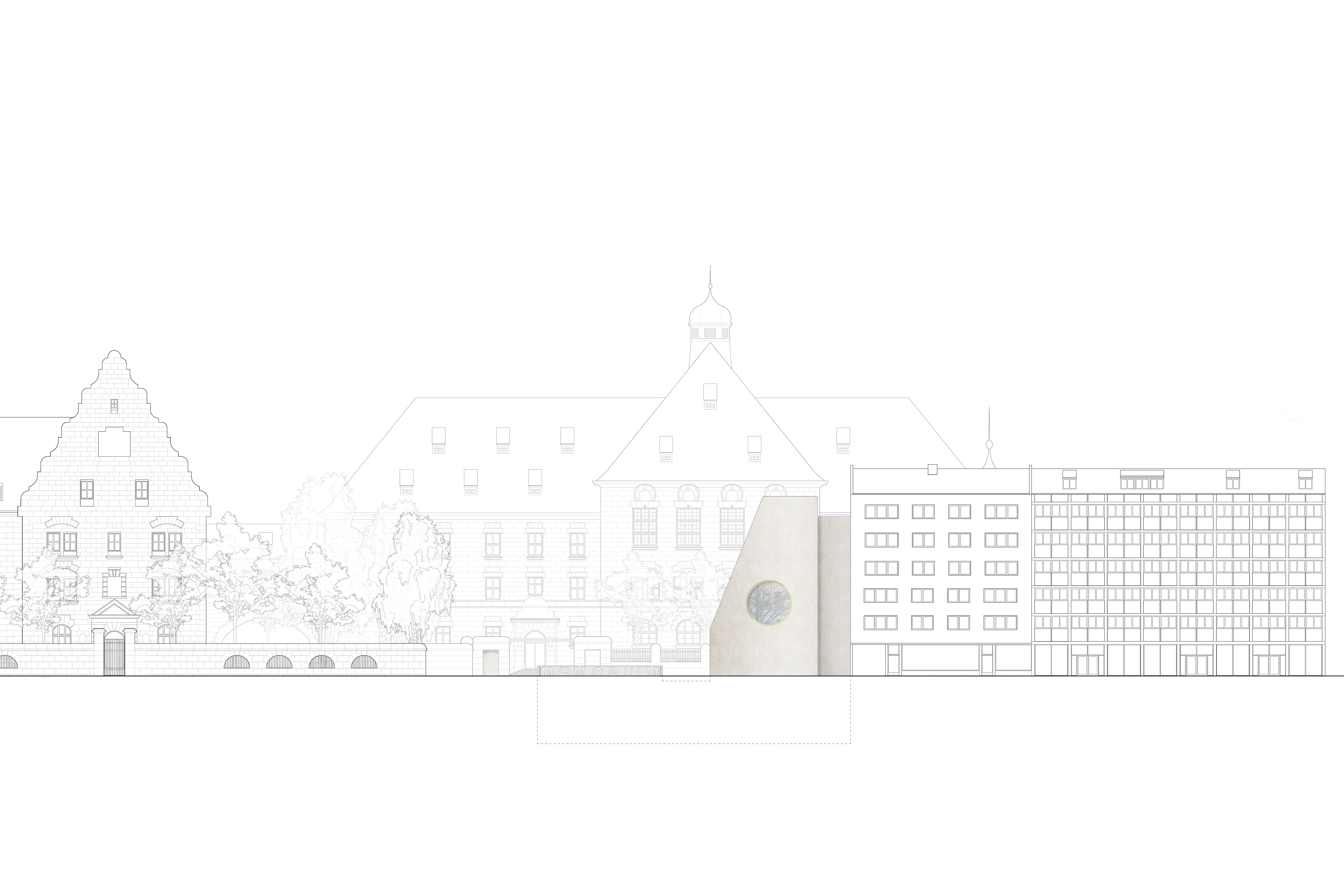 Der Justizpalast mit dem Ostflügel hat die Besonderheit, dass die Hauptattraktion sich in 2. Reihe zur Fürther Straße befindet. Daher bildet das ergänzende Bauwerk des Besucherzentrums ein untergeordnetes, begleitendes Volumen, das sich in der Höhenstaffelung zurückbildet, um die visuelle Integrität des Memoriums vollständig zu wahren. Als Besucherzentrum übernimmt es zentrale Servicefunktionen. Neben Tickets und Information zum Memorium finden die Besucher hier ein Café, einen Museumsshop, Seminarbereiche und einen Raum für Sonderausstellungen. Das Gebäude dient zudem als alleiniger Zugang zum Memorium und leitet über die große unterirdische Halle zum musealen Rundgang ein. Die Besucherströme werden im Neubau klar geordnet. Einzelne Räume sind konsequent nach Inhalt und Nutzung angeordnet. Soweit es geht, haben wir in allen Bereichen maximale Flexibilität und Raumerweiterung ermöglicht. Die an der Fürther Straße sichtbare Schnittfigur des Gebäudes fungiert als Abschluss des östlichen Blockrandes und erscheint mit ihrer abstrakten Fassade beinahe maßstabslos. Die bildet so einen würdigen Auftakt für den Justizpalast und grenzt sich bewusst von der angrenzenden Nachbarbebauung ab.