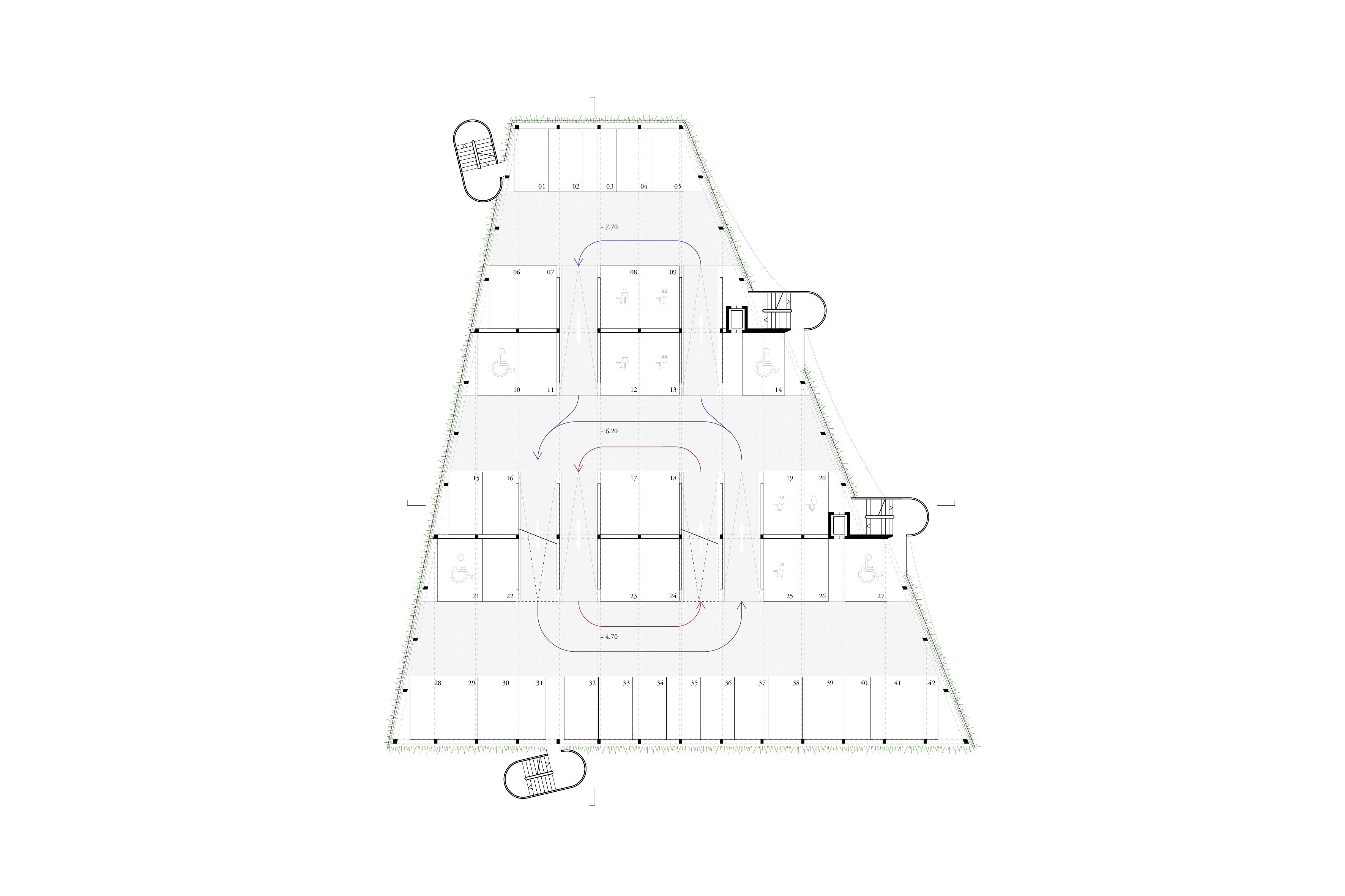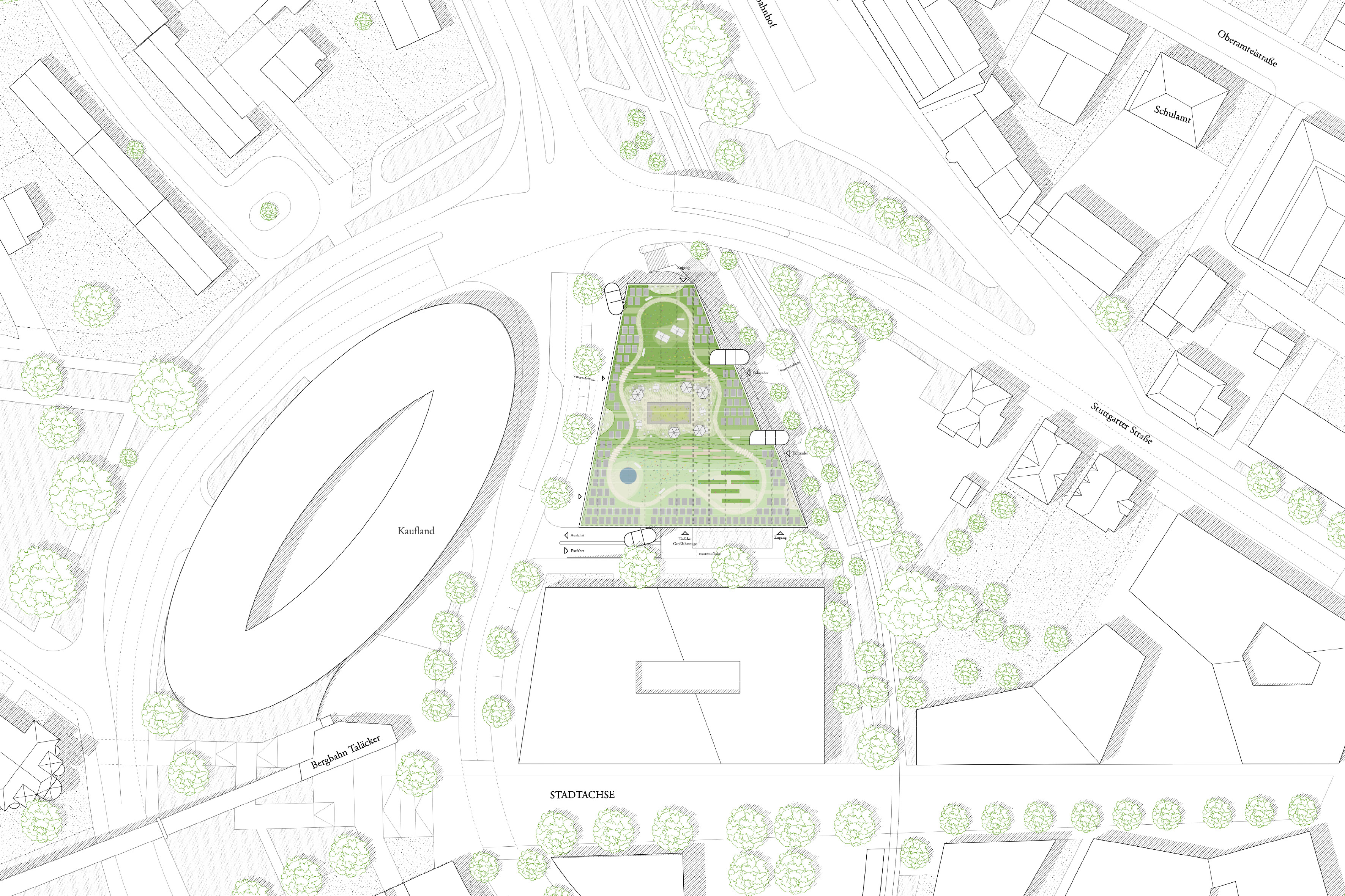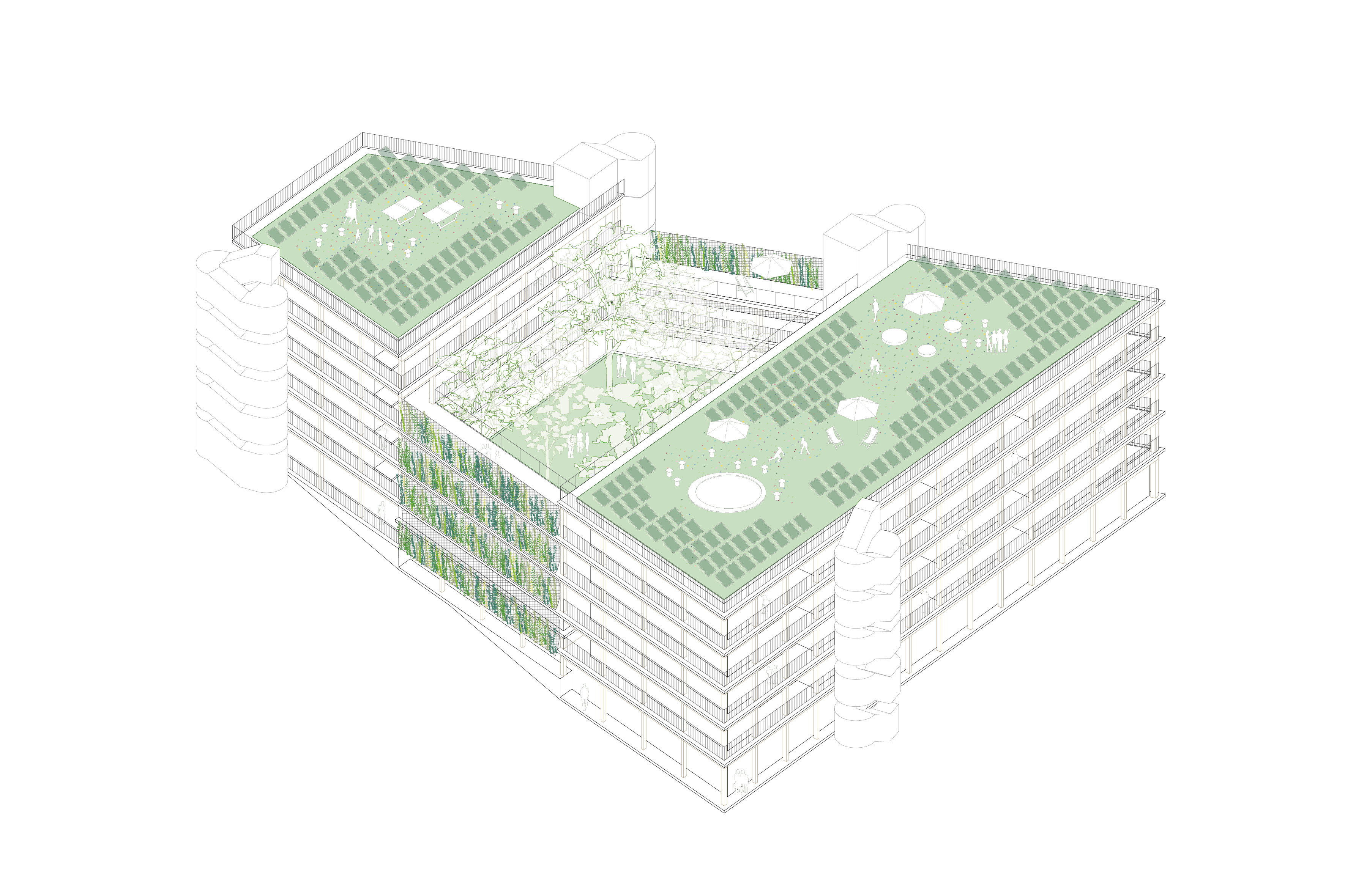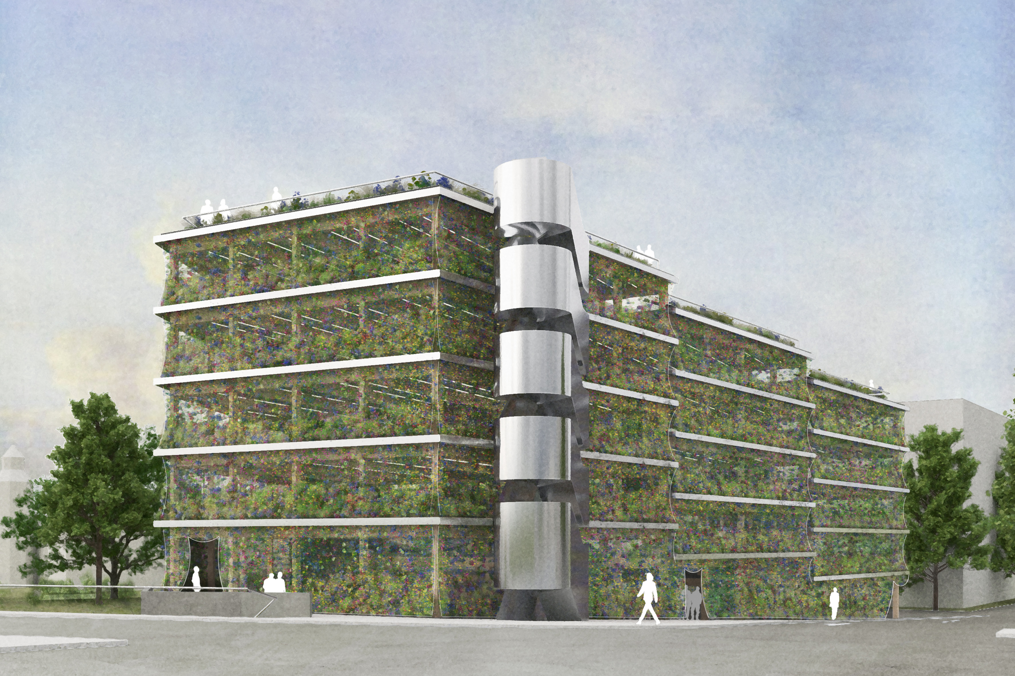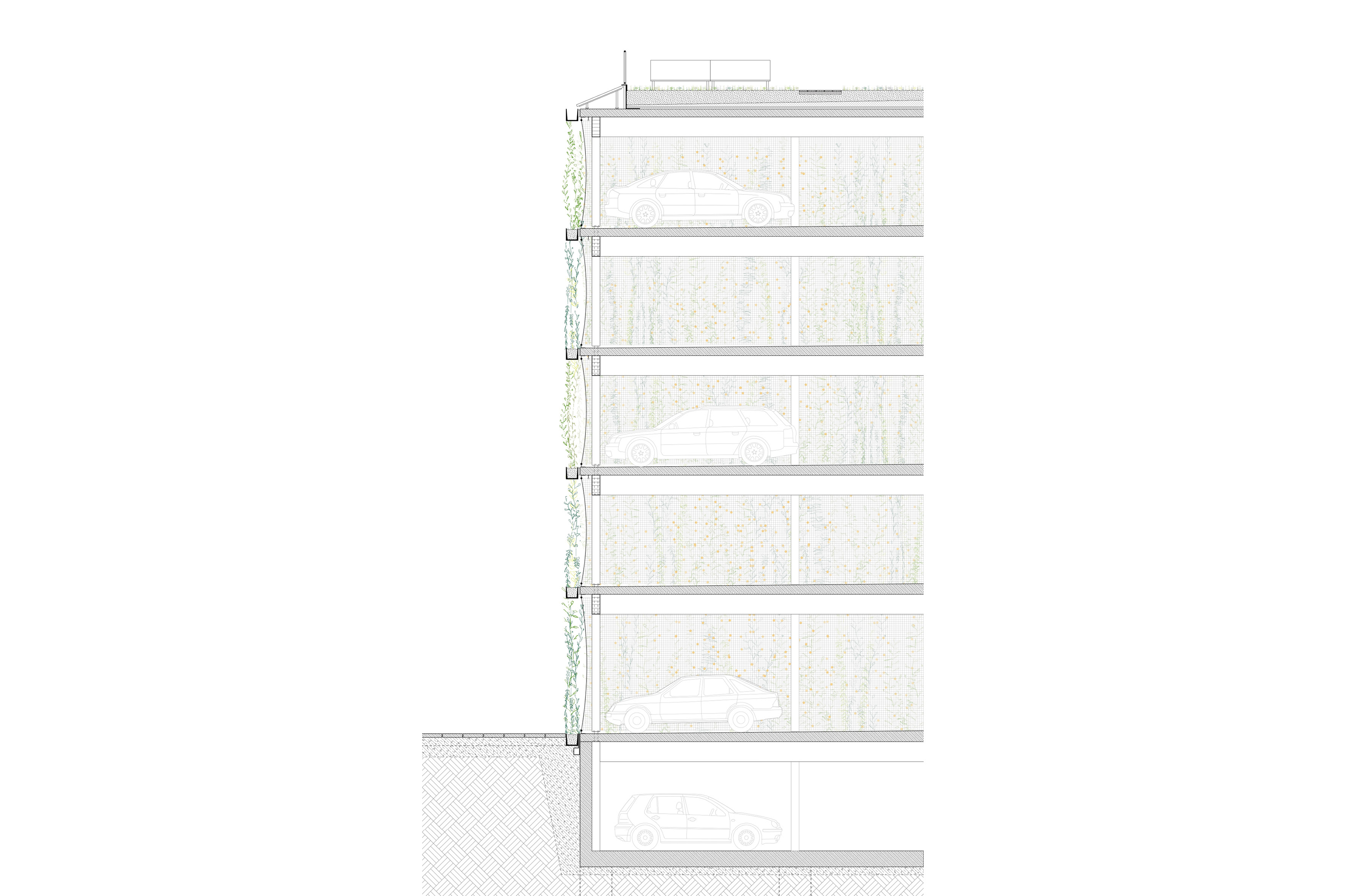Aus der Verwunderung einen solch prominenten Ort für das Parken zu nutzen, reagiert der Entwurf und verschleiert bewusst das Innere mit Bändern satten Grüns und einem jahreszeitlich durch- blühenden Vorhang. Ein Haus, das atmet und neben Autos auch Insekten und Tieren ein Zuhause gibt. Aber auch für die Menschen in Künzelsau will es neben der Erscheinung einen Mehrwert bilden, und so ist das Dach als ein großer Garten konzipiert, der frei zugänglich mit einem einfachen Kiosk in der Mitte zur Rooftop-Bar, Treffpunkt und Lebensort wird. Ein Geschenk also, mit der Hoffnung, dass es angenommen wird und durch die Bürger bespielt und belebt wird. Der Entwurf ist konsequent aus der Nachnutzung heraus gedacht und aus der Frage, wie an diesem Ort einmal Woh- nen und Gewerbe aussehen könnte - vielleicht eher als klassisches Stadthaus denn als Parkhaus. Dieser Ansatz wird weitergehend auf das Erscheinungsbild, die Architektur und die Konstruktion übertragen: Das Gebäude als blühendes Objekt, welches dem wichtigen städtebaulichen Ort gerecht wird und zu einem identitäten Objekt wird - ohne in direkte Konkurrenz zum Kreishaus zu treten.