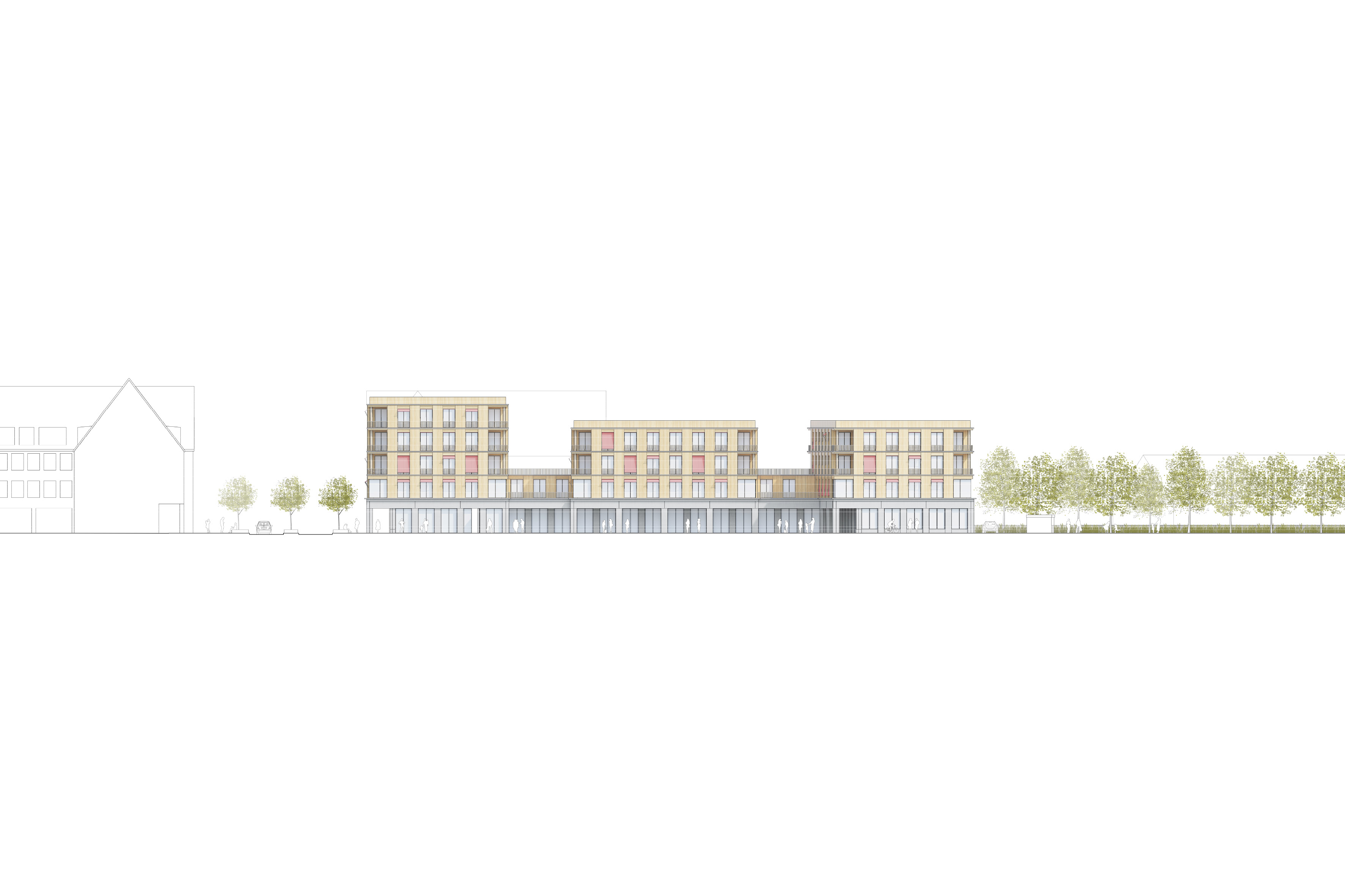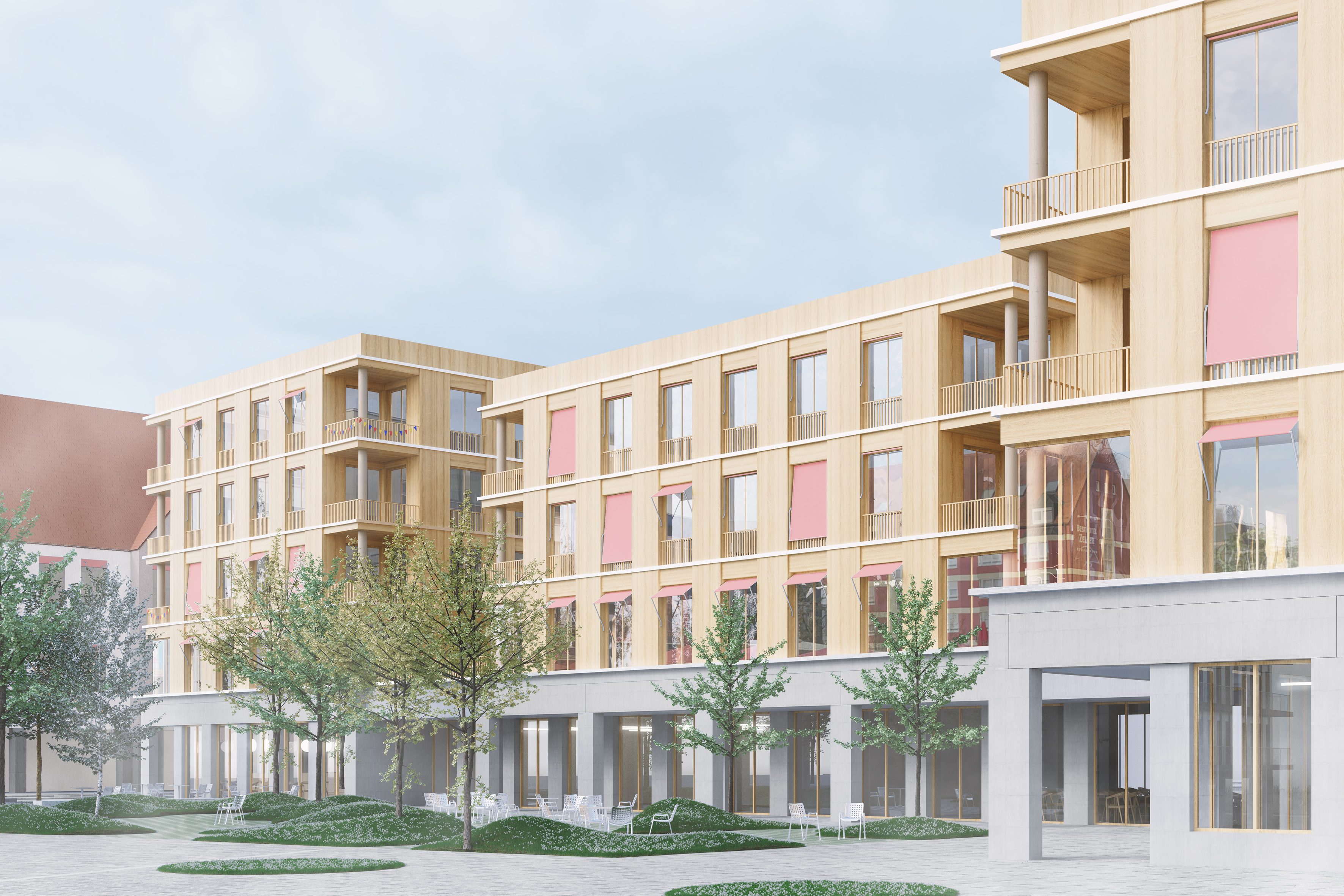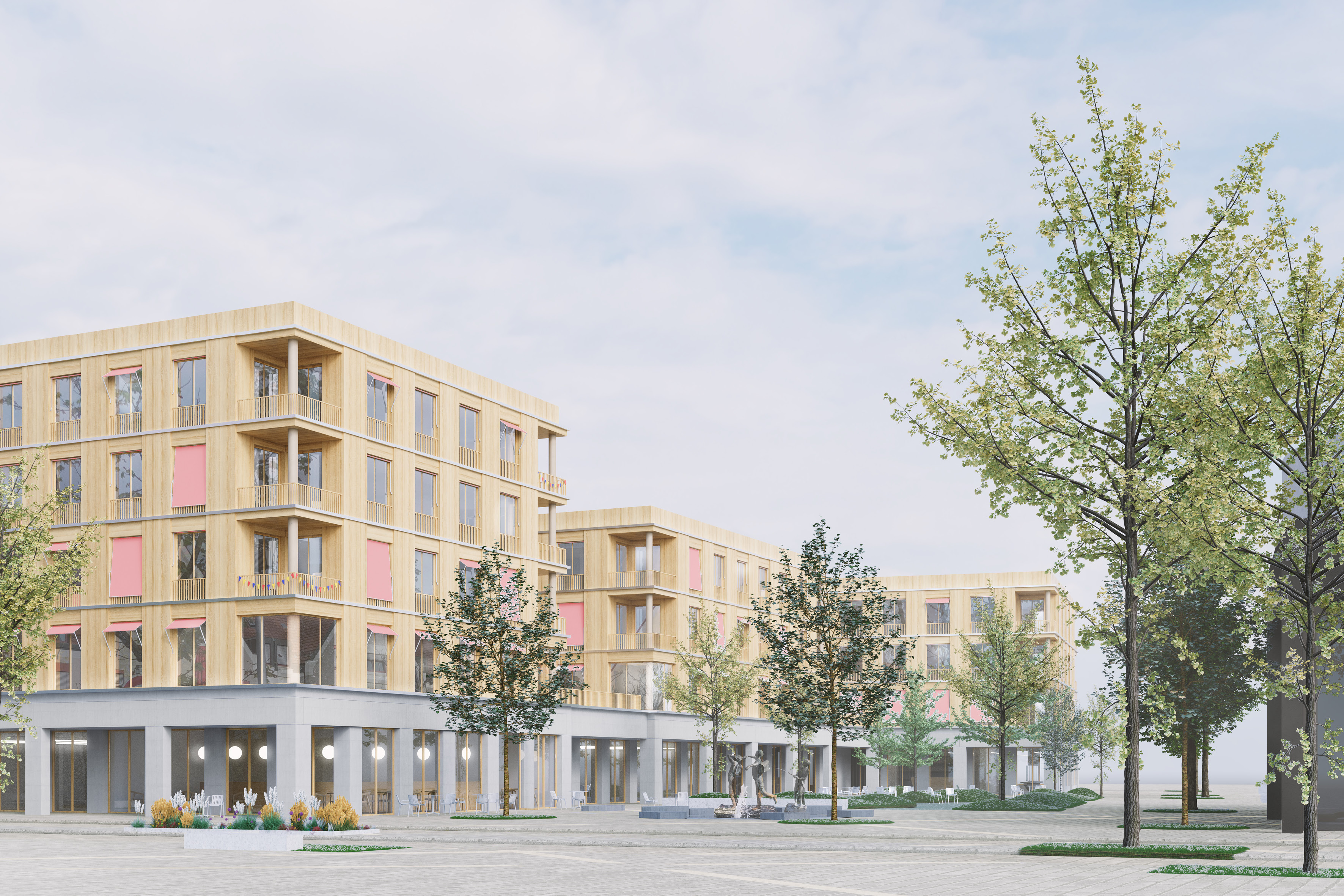 Am Europaplatz erhält die Stadt Königsbrunn ein Ensemble, dass ein Zusammenspiel aus flexibler und anpassungsfähiger Struktur und leichten, einzelnen Baukörpern ohne Kompromisse erzeugt. Dauerhaft und langfristig kann so lebendiger Stadt- und Wohnraum geschaffen werden, bei gleichzeitig serieller und wirtschaftlicher Bauweise.