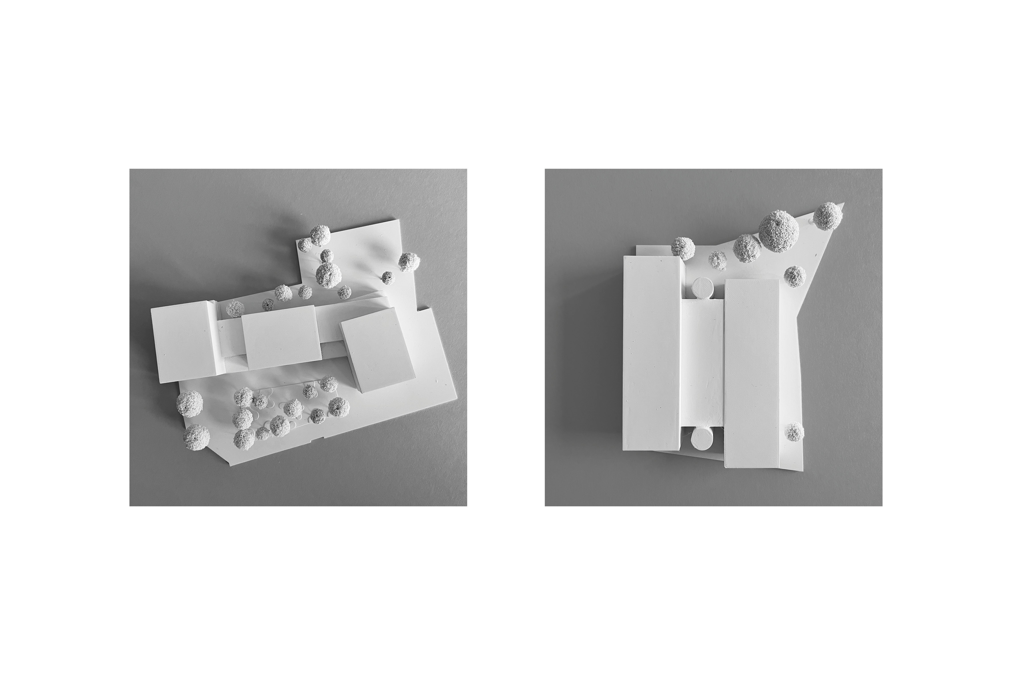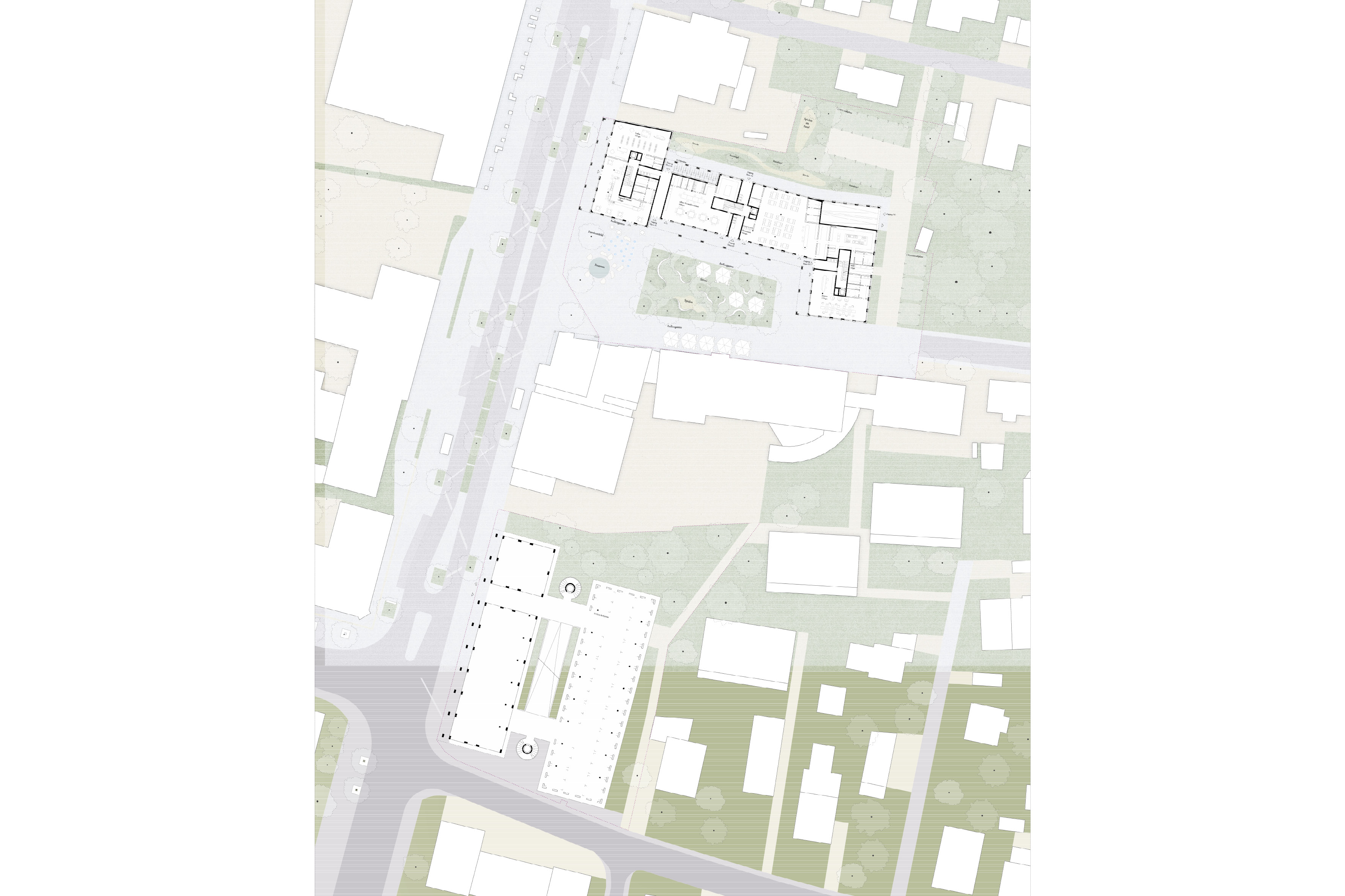 Ein durchgehendes Sockelgeschoss fasst mit einer Kolonnade den öffentlichen Platzraum und nutzt dabei die Länge des Grundstückes in Ost-West Richtung nahezu vollständig aus. Darauf setzen sich drei formgleiche Volumenkörper. Der an der Bürgermeister-Wohlfahrt-Straße gelegene wird um ein Geschoss erhöht und markiert einen Kopfbau. Der östliche Baukörper dreht sich orthogonal zur südlichen Bebauung und schließt den Platz ab. So gelingt es die Baumasse in dem Ort entsprechende Volumen zu gliedern, bei gleichzeitigem Angebot einer städtischen Kolonnade und durchgehender Laden- und Bürozonen. Die entstehenden Fugen zwischen den Volumen verbessern die Belichtungs- und Belüftungssituation für das Gebäude, aber auch den angrenzenden Platzraum und eröffnen spannende Durch- und Einblicke.