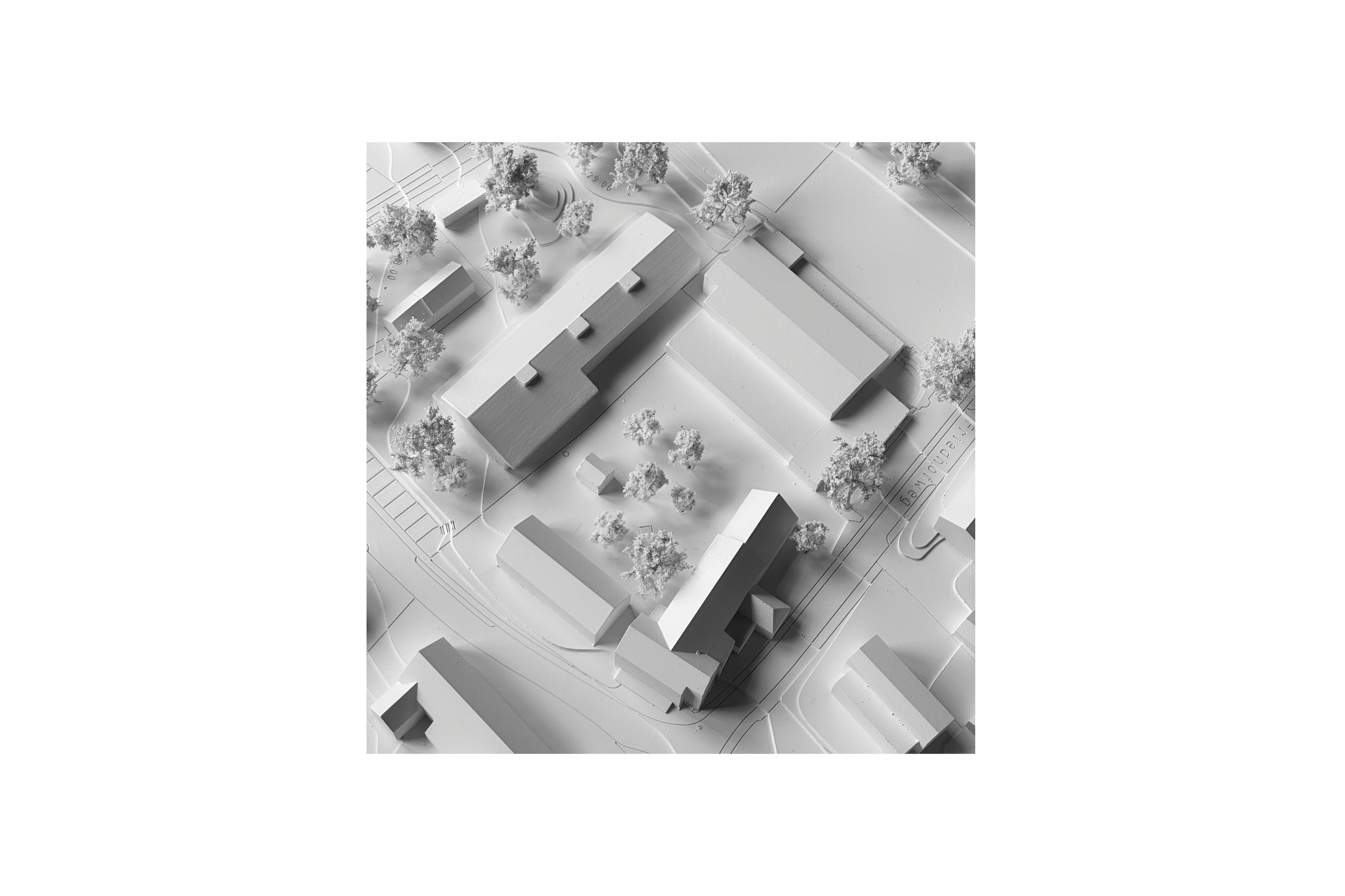 Eingebettet zwischen Dorfstraße, Hauptstraße, Friedhofsweg und Kirchweg sammeln sich in Hergensweiler die öffentlichen Bauten, eingebettet in einen schönen Grünraum. In diesem ergänzt sich subtil der Neubau der Kita. Zusammen mit Grundschule, Leiblachhalle und Pfarrheim ergänzt die Kita das Ensemble zu einer Art Vierseithof, in dessen Mitte ein gemeinsamer Platzraum entsteht. Durch die längliche Figur gelingt die Ausbildung einer Raumkante, bei gleichzeitigem direktem Bezug aller Gruppenräume in den Grünraum auf der Gartenseite. Das raumgreifende Dach bildet im Bereich des Veranstaltungsraums einen überdachten Außenraum und erlaubt eine klare Adressierung dieses Raums zum Hofraum, auch im Hinblick auf eine Nutzung außerhalb des Kitabetriebes.