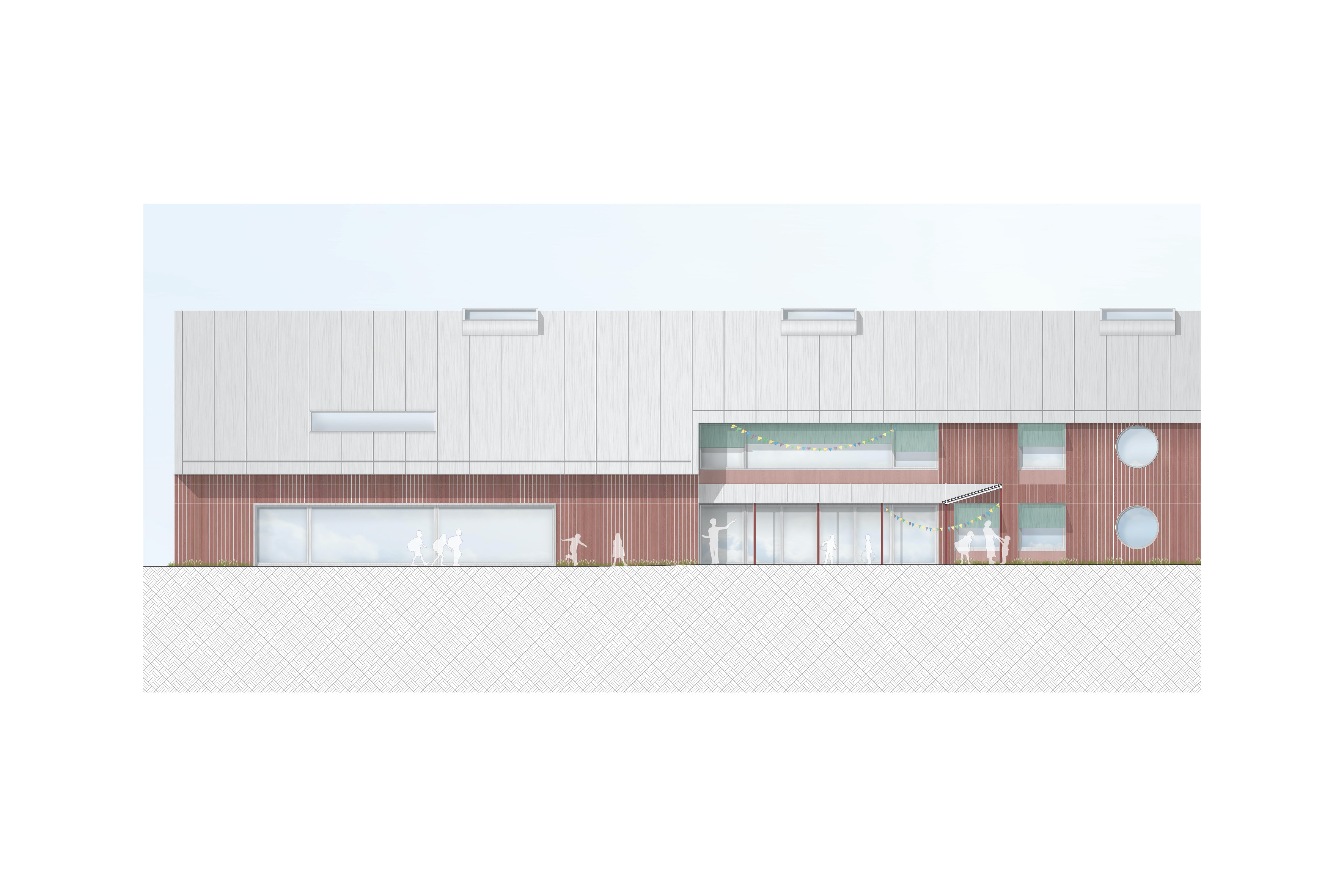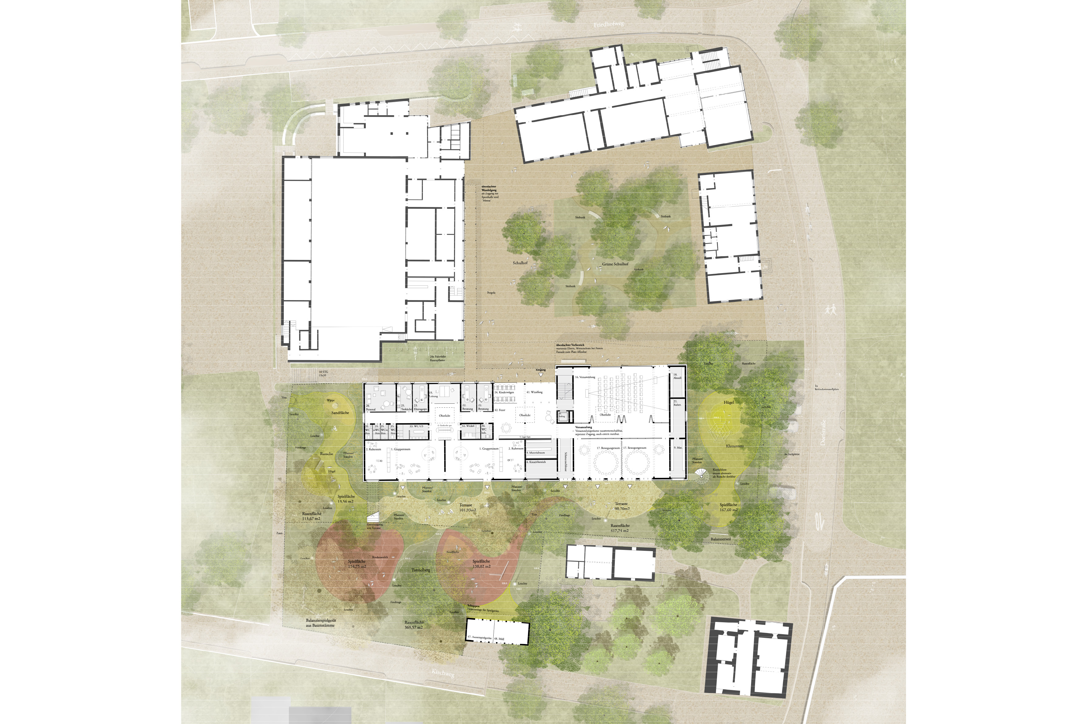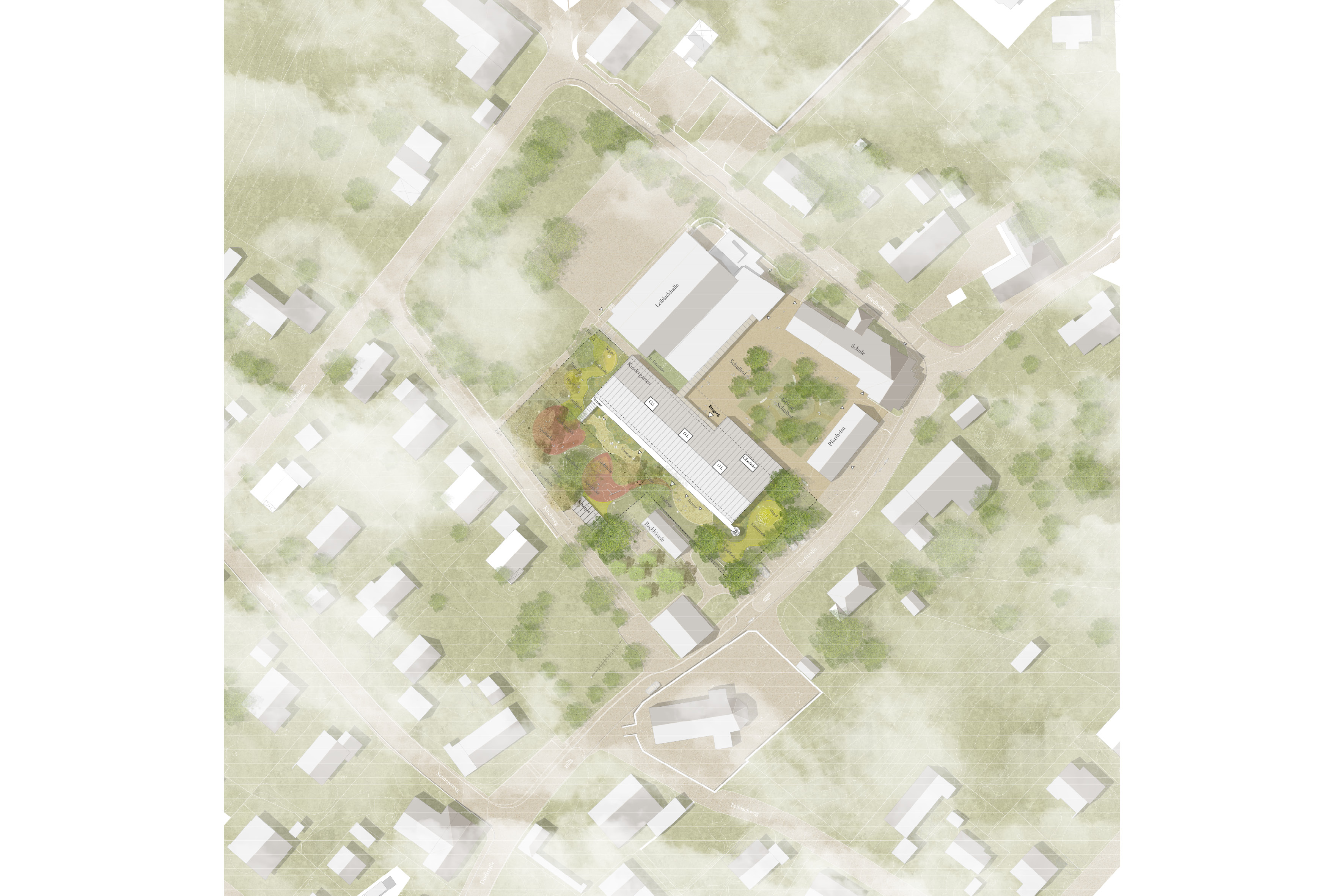 Ein einfacher Baukörper schließt den Vierseithof und bindet diesen zu einem Ensemble. Außen greift der Entwurf ortstypische Elemente, Farben und Materialien auf und übersetzt diese in zeitgemäße Architektur, die im Spannungsfeld von ortsbezogener Spezifik und zugleich übergeordneter Gültigkeit schwingt. Innen bieten Lufträume, horizontale Raumtaschen und Erweiterungen Kindern eine lebendige Erlebnis- und Lernlandschaft. Der Garten als Teil des ortsmittigen Grünraumes wird atmosphärisch erhalten und als Abenteuerwelt für die Kinder gestärkt.
