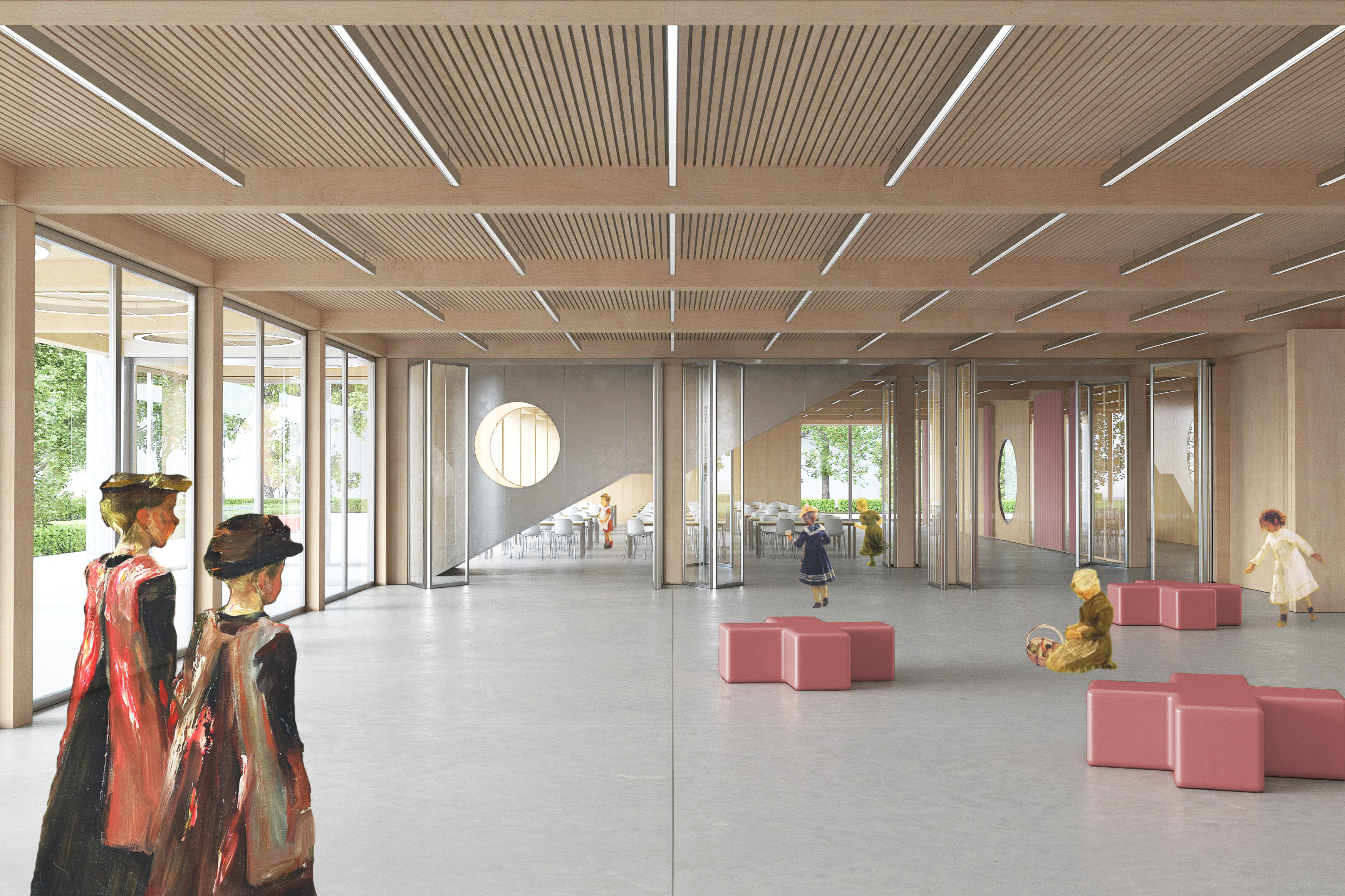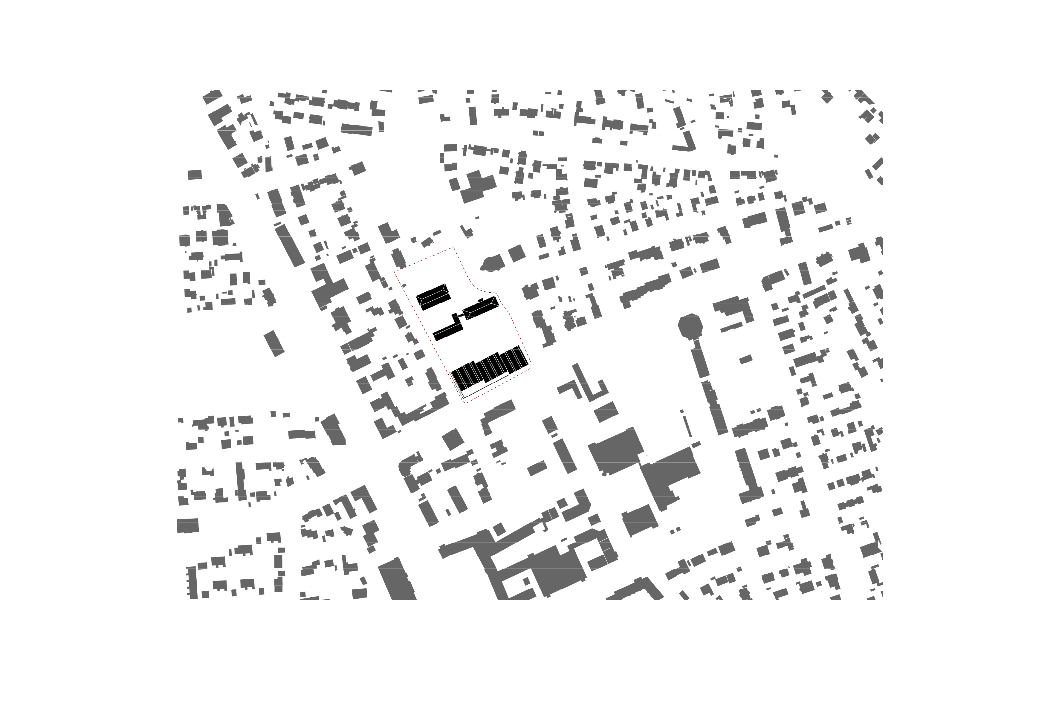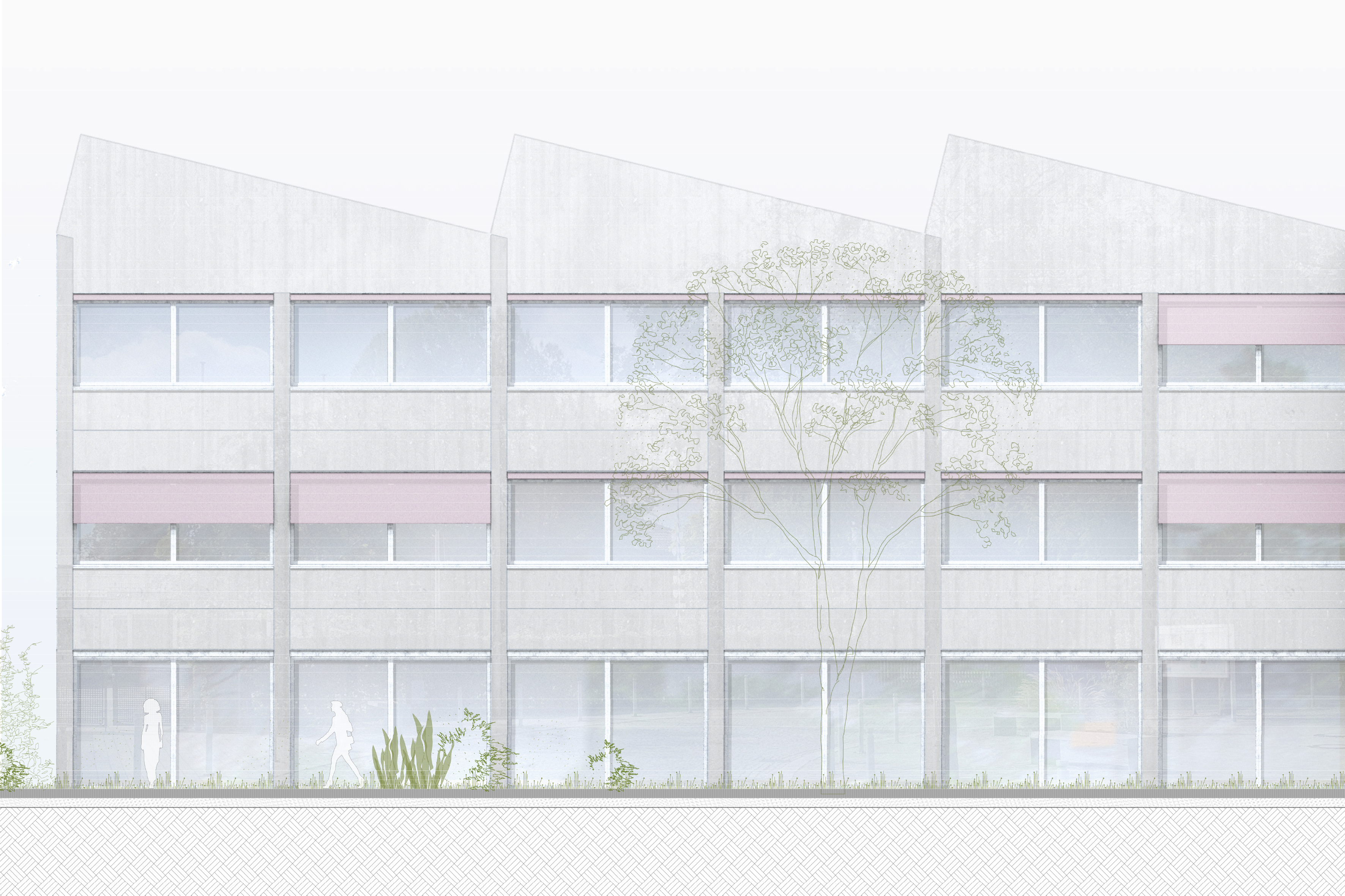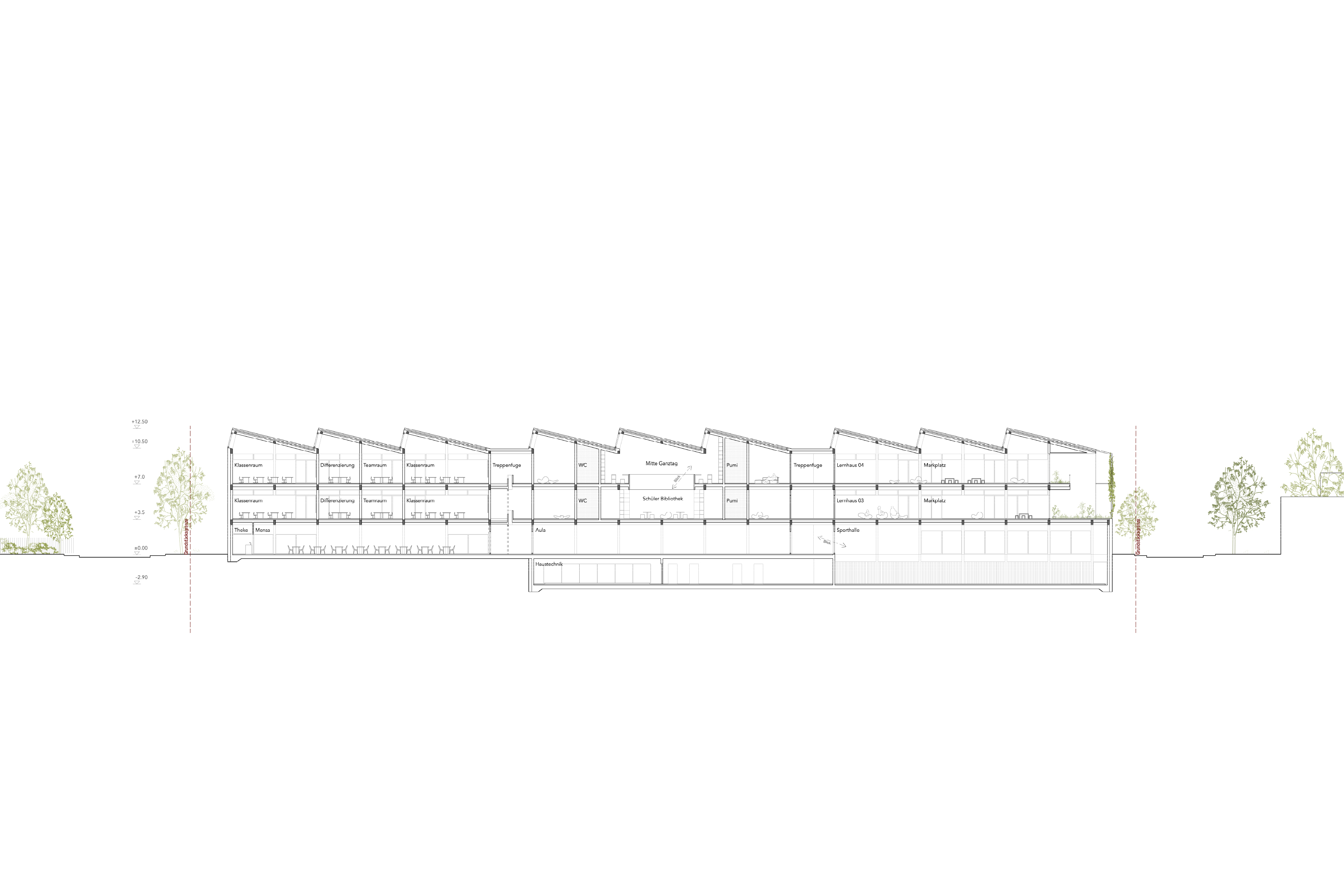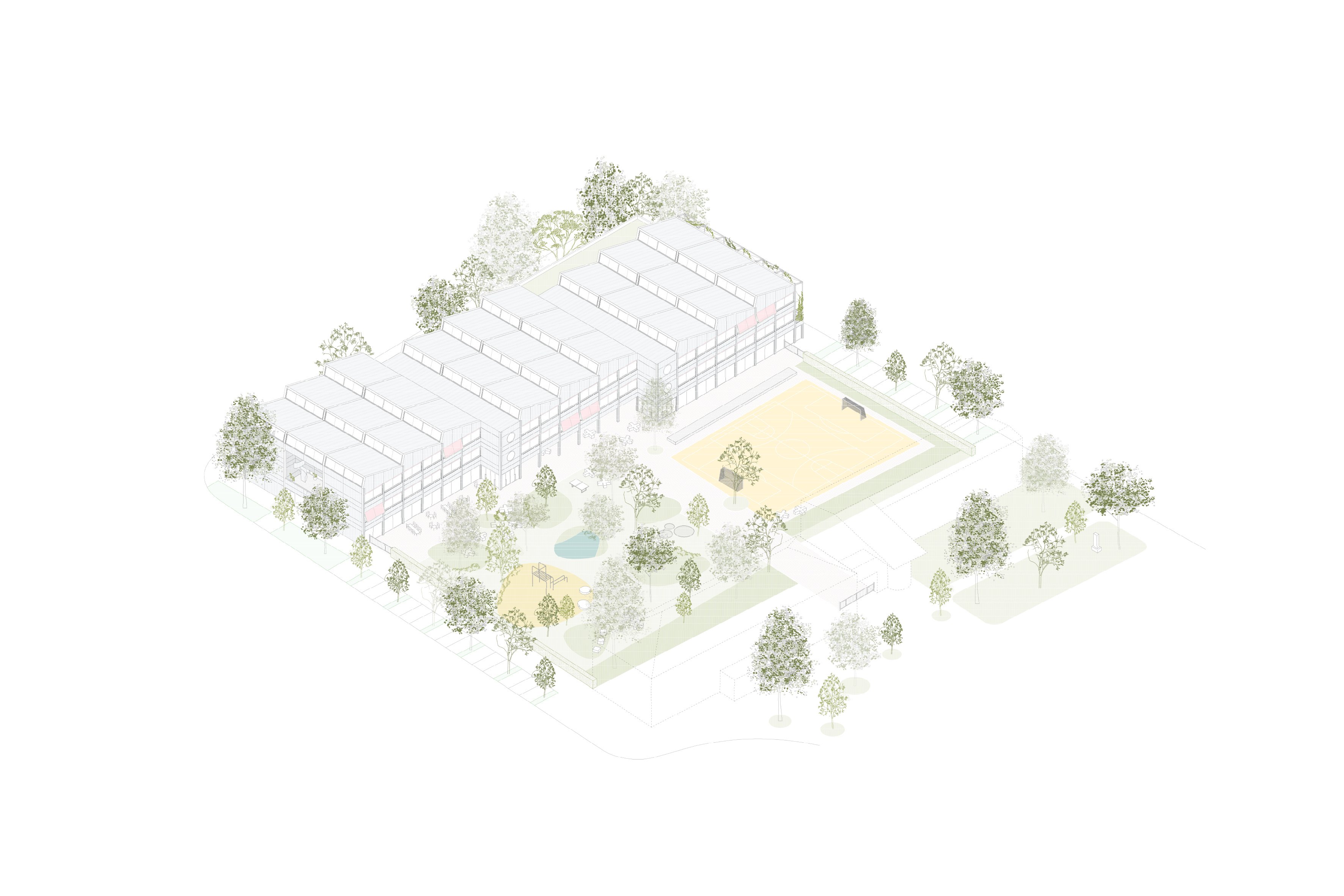 Durch die Gliederung des Baukörpers in drei Abschnitte und das feinteilige Sheddach, entsteht eine angemessene Körnung und Maßstäblichkeit für die Grundschule im Kontext der kleinteiligen Siedlungsstruktur. Mit dessen Setzung entlang der Straßenkante bilden sich drei Ost-West Achsen mit unterschiedlichen Qualitäten: Schulgarten, Plaza und offene Wiesenfläche.