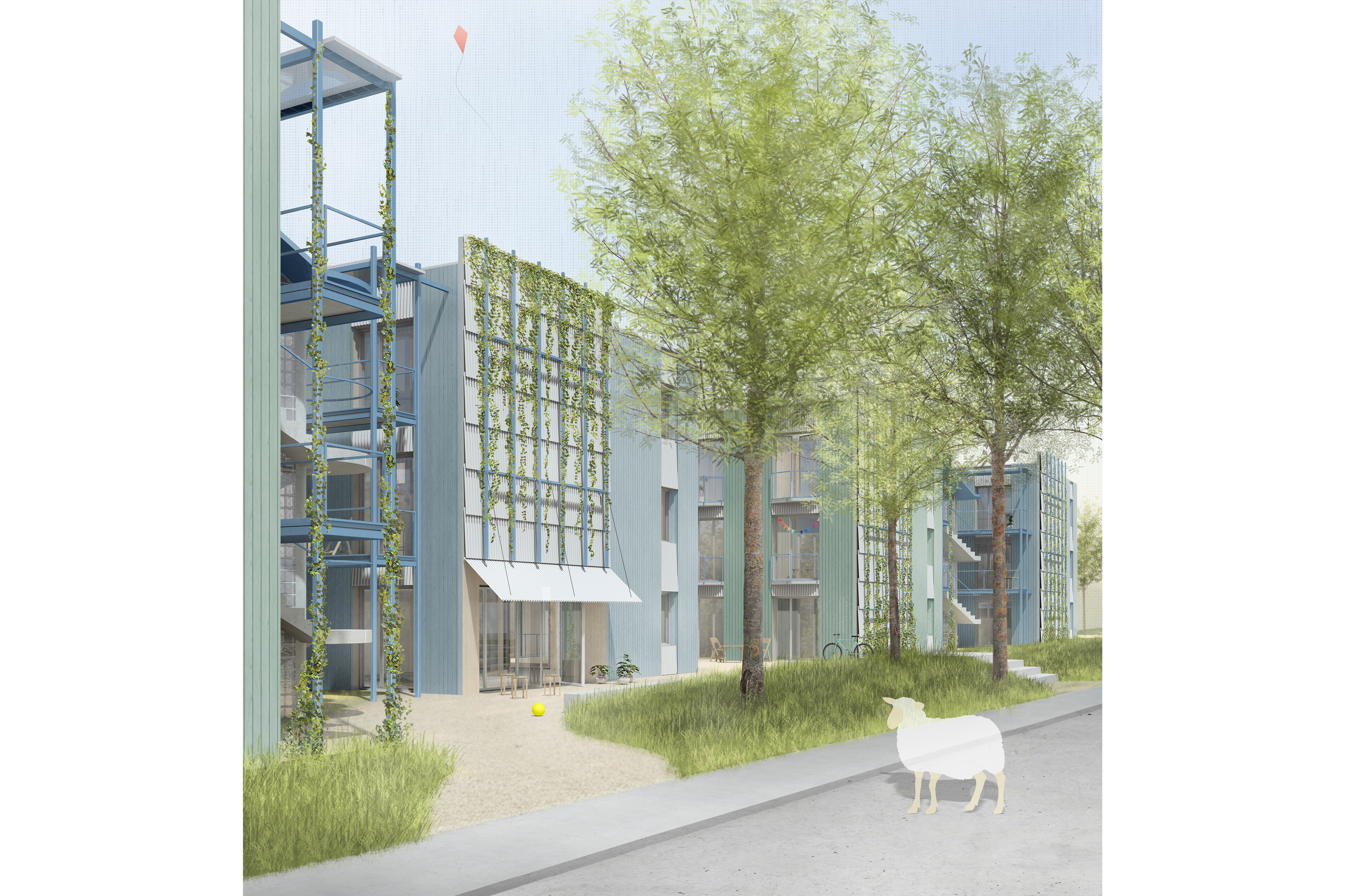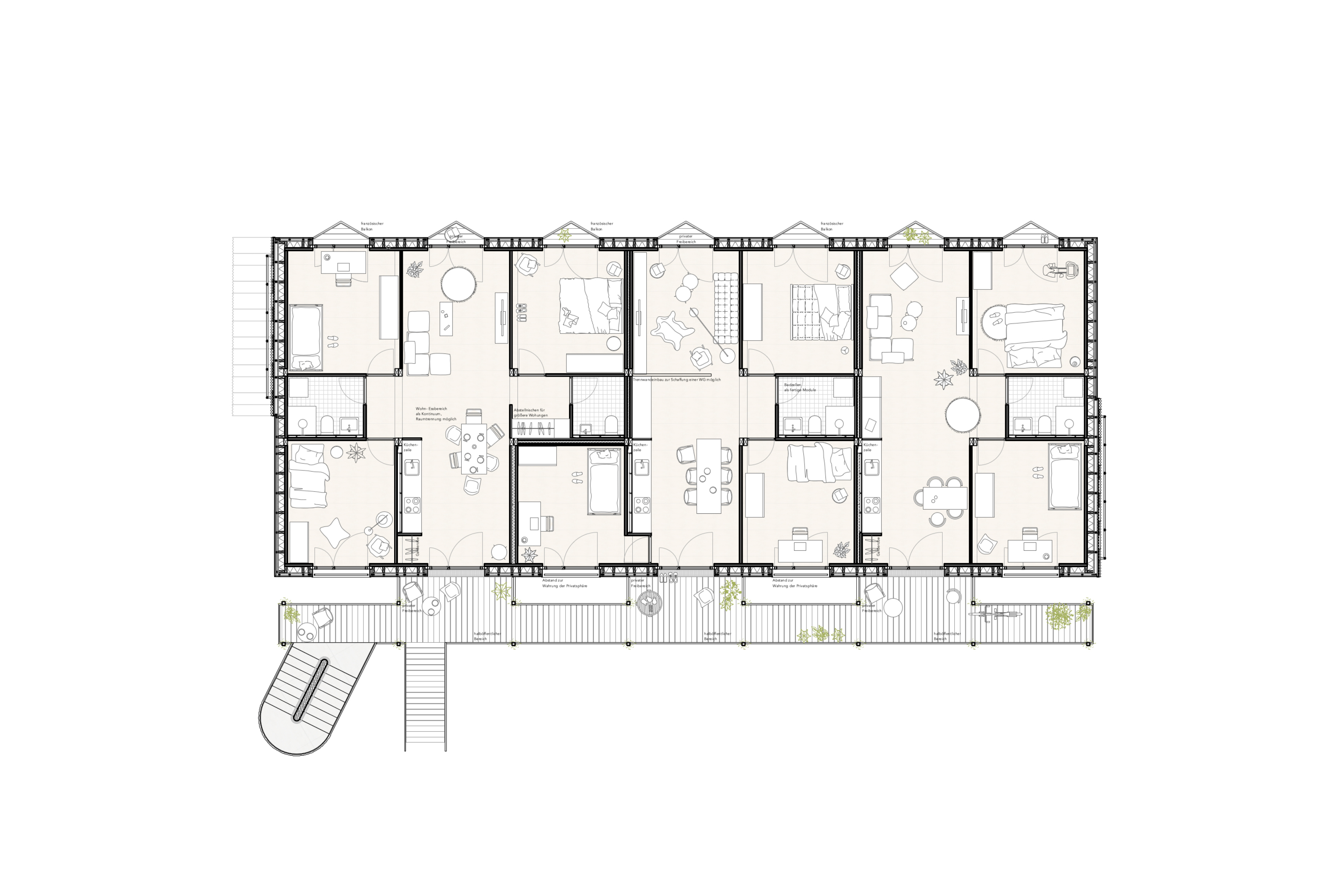 Geförderten und sozialen Wohnraum für Menschen in prekären Lebenssituationen zu schaffen bedeutet, eine dauerhafte Typologie zu erstellen, die robust, einfach und effizient ist, aber zugleich Gemeinschaft und eine gesunde soziale Kontrolle fördert. Die vorgeschlagene Laubengangerschließung als Zusammenschluss jeweils zweier Wohnhäuser kombiniert die sozialen Vorteile des Reihens halböffentlicher und privater Freiräume mit einer effizienten Erschließung. Die resultierende angenehme Gebäudetiefe erlaubt hervorragende Belichtung und Belüftung der einzelnen Wohnungen ohne technischen Aufwand.